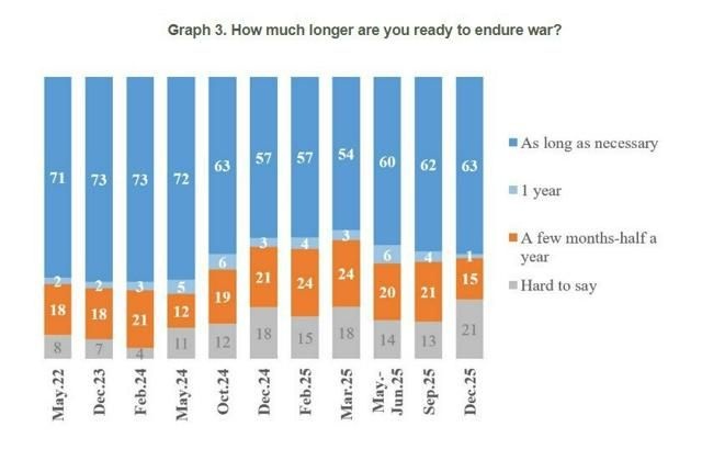戦争の継続に関する質問は、ロシアによる全面侵攻が始まった22年から実施されており、今回で11回目。「必要なだけ耐える」という回答は一貫して5割を超えている。今回調査では「あと1年」が1%、「あと数カ月から半年」が15%だった。