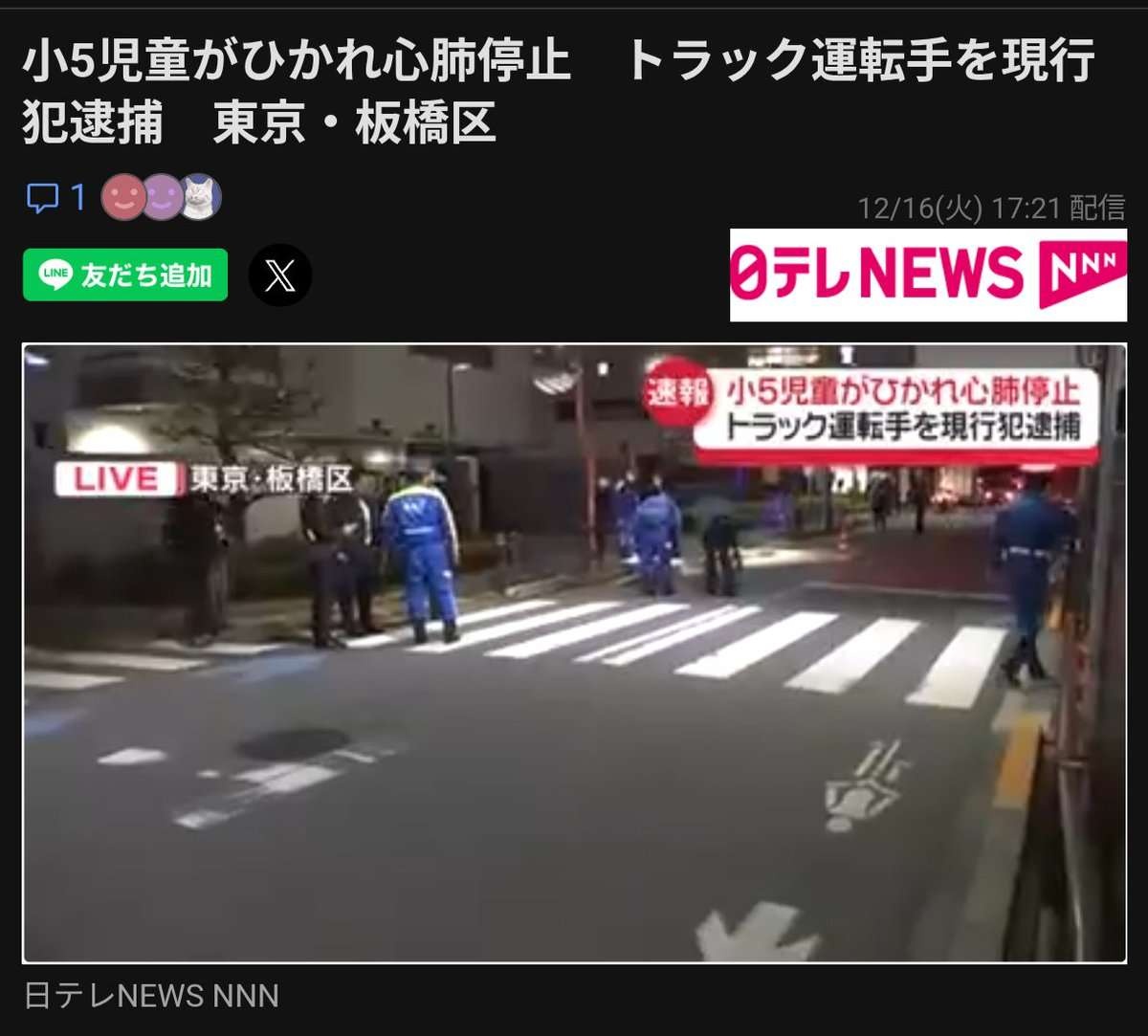 小5児童がひかれ心肺停止 トラック運転手を現行犯逮捕 東京・板橋区(日テレNEWS NNN) – Yahoo!ニュース