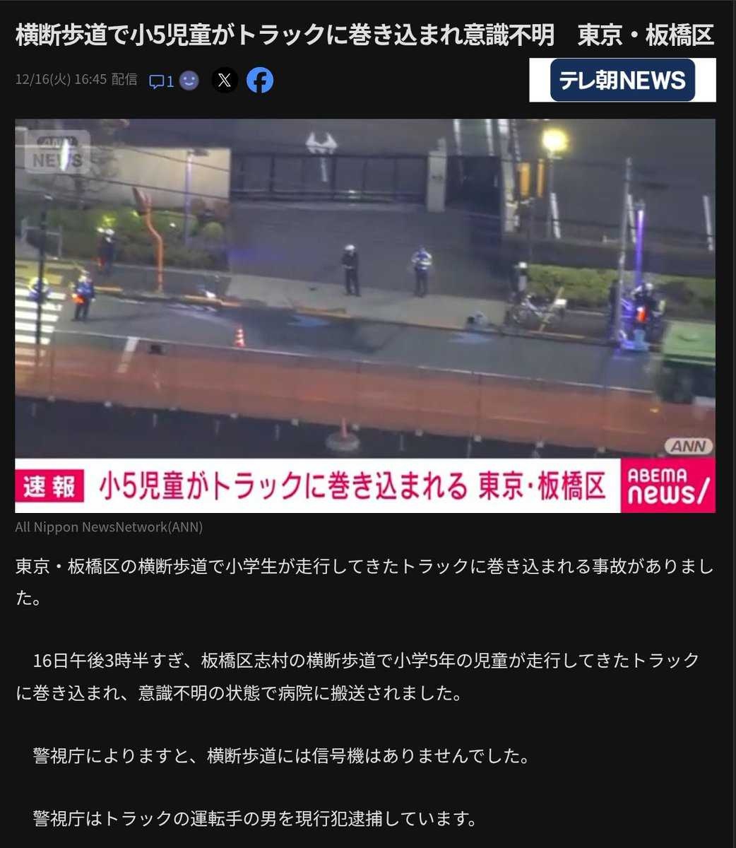 https://news.yahoo.co.jp/articles/9e4ca0f6fc436c601ab88b11dcdf60a51b462dd216日午後、東京・板橋区で小学5年生の児童がトラックと衝突する事故があり、心肺停止の状態となっています。現場から中継です。