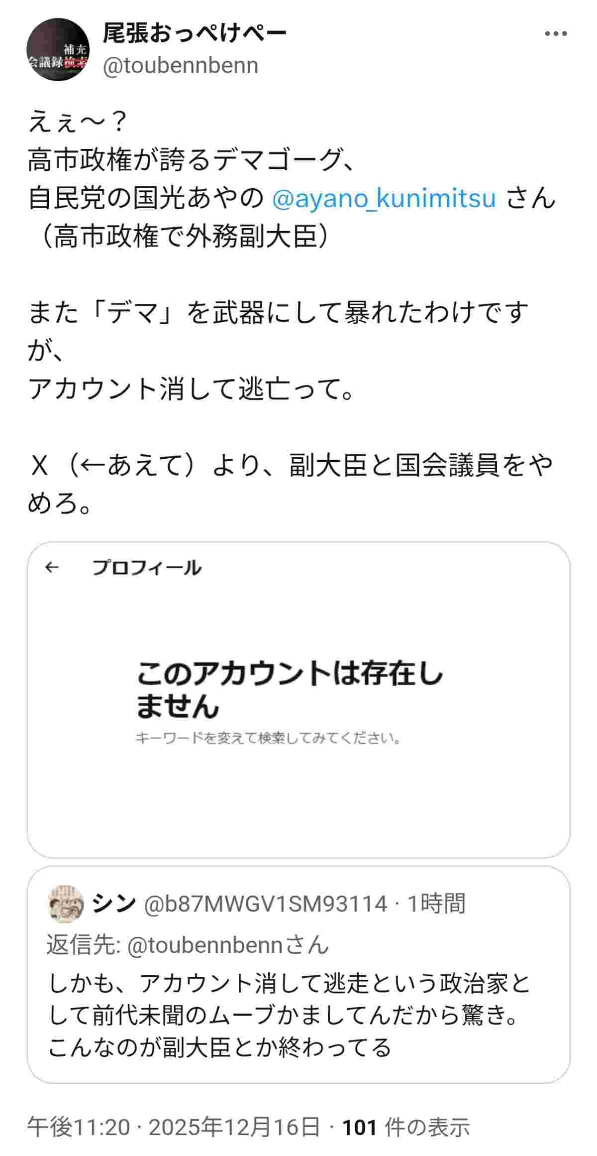 「デマ発信」自民党の国光あやの外務副大臣、アカウント消して逃亡!