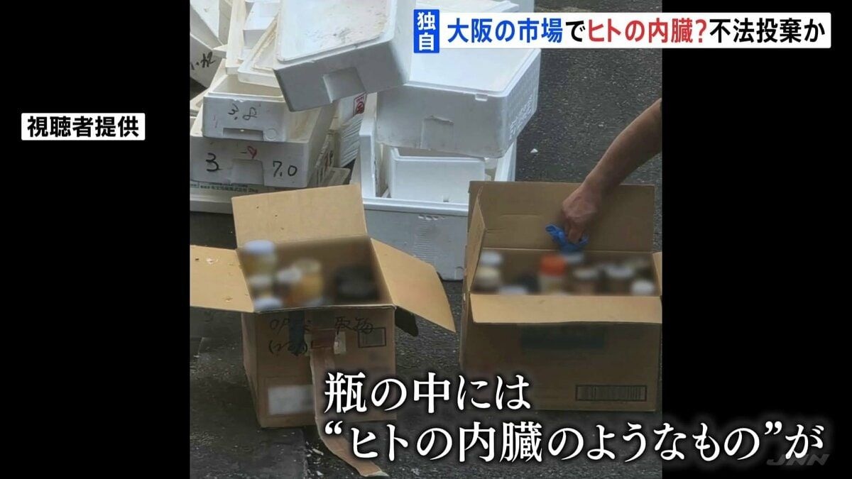 大阪の卸売市場で、大量のヒトの内臓のようなもの入り瓶見つかる