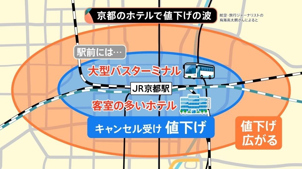 そこでキャンセルが相次ぐと、値下げをすることになります。駅周辺の大型ホテルが値下げをすると、周辺のホテルも価格競争に追いつくために値下げをし、値下げの波が徐々に広がっているということです。