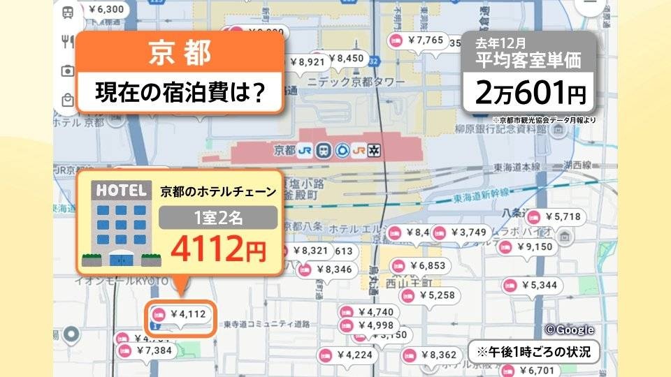 2024年12月の京都の平均客室単価は2万601円でした。それが、18日午後1時ごろの状況ですと、4000円台が多く3000円台もあります。8000円台でも今だと高い部類になっています。ある京都のホテルチェーンは、1室2名で4112円となっています。