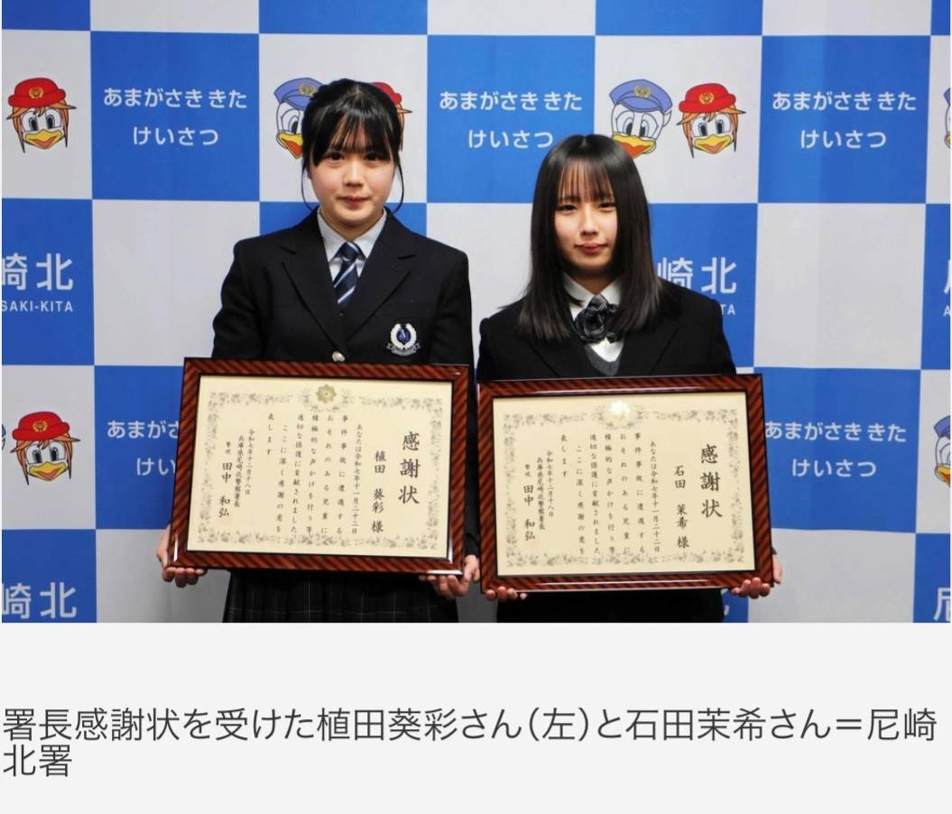 公園に1人でいた小学6年の男児(12)を家まで送り届けたとして、尼崎北署(兵庫県)は、尼崎市内の高校に通う女子生徒2人に感謝状を贈った。2人は「本当にやってよかった」と自分たちの行動を振り返った。
