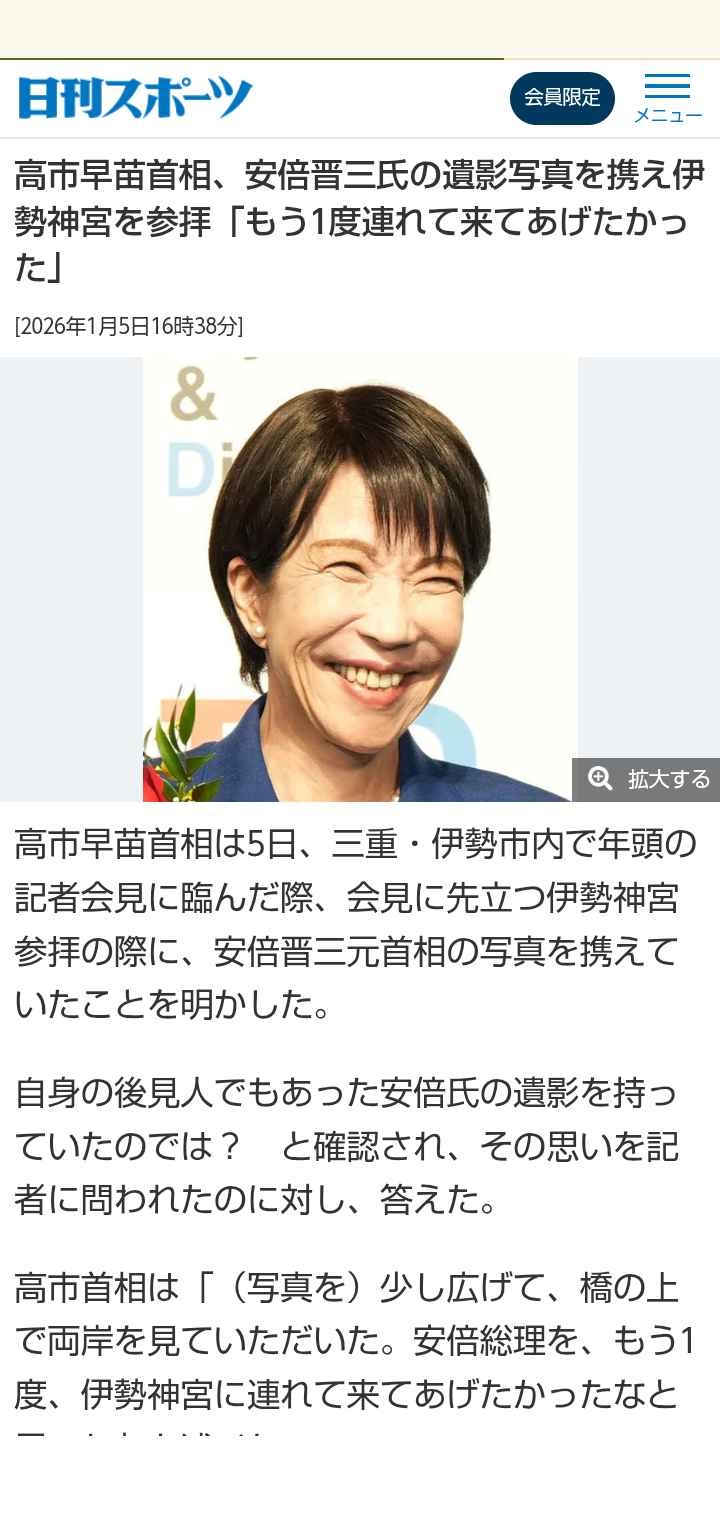 高市早苗首相は5日、三重・伊勢市内で年頭の記者会見に臨んだ際、会見に先立つ伊勢神宮参拝の際に、安倍晋三元首相の写真を携えていたことを明かした。