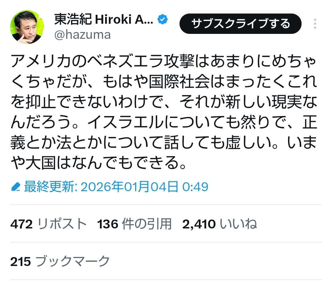 何か気に入らないことがあれば攻めて大統領拘束して自国で裁判していいという前例出来たことに驚くだろ