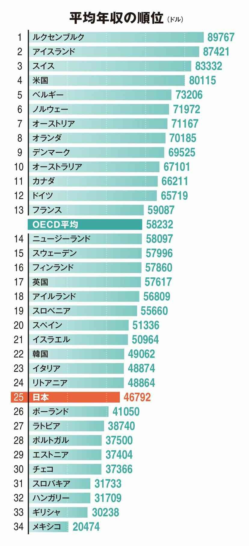 購買力平価(PPP)換算でも低い: 購買力平価(PPP)で換算した実質年収でも、OECD平均やルクセンブルクなどの上位国と比較してかなり低い水準です。