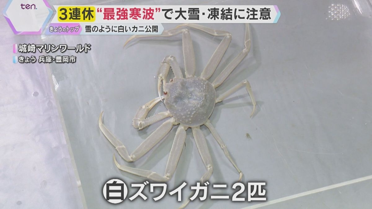 兵庫県北部の沖合で水揚げされた雄雌1匹ずつの白いズワイガニが、豊岡市瀬戸の水族館「城崎マリンワールド」へ運び込まれた。いずれも全体が白く、雄は9日、展示水槽に入れられ来館者の注目を集めた。抱卵している雌は飼育スペースで育て、ふ化後のカニの幼生は親ガニまで育てる計画だ。