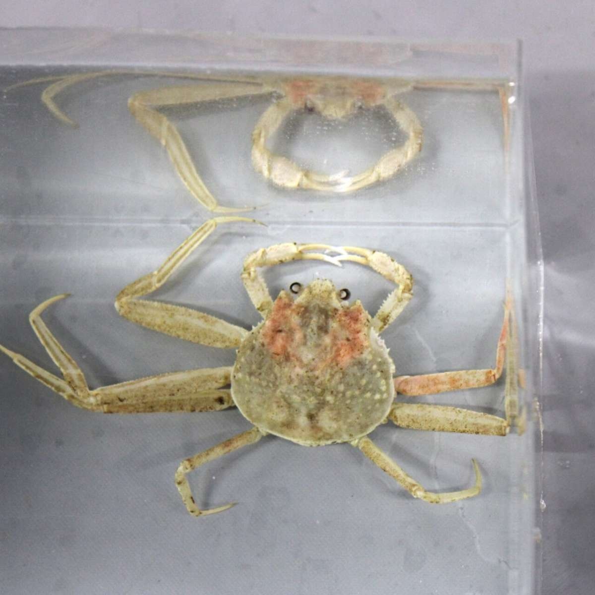 いずれも目などには色素が残っており、全体に色素が発現していない状態とみられる。甲羅は透けるように白く、雄は肝膵臓(すいぞう)(かにみそ)で青みがかり、雌は内子で朱色がかっている。