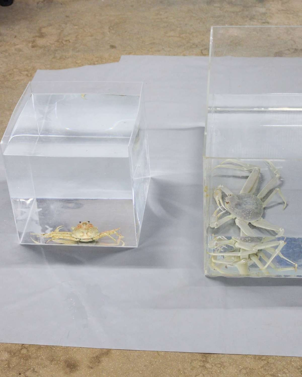 マリンワールドの伊藤公一飼育課長は「白い個体は小さな時から目立つので狙われやすい。どちらも10年近くよく生き延びたと思う」と説明。卵から10年間をかけて親ガニにまで育てる「カニプロジェクト」に17年から取り組んでおり「稚ガニが白くなるのか見ていきたい」と新たな発見に期待した。