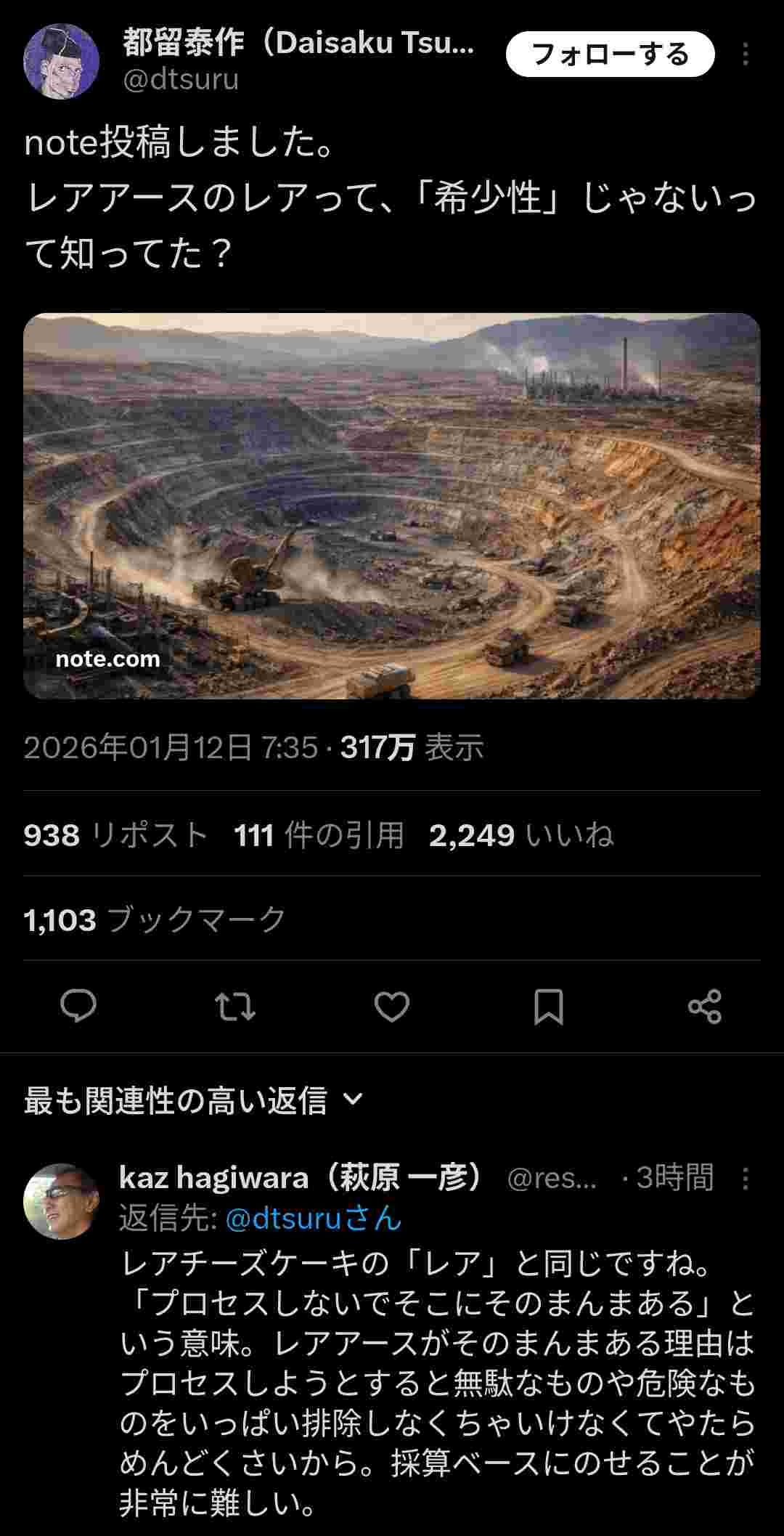 嘘かデマか知らないけどネトウヨは日本の深海のレアアースは純度が高いから環境負荷も低くて問題ないとか言い出してるな