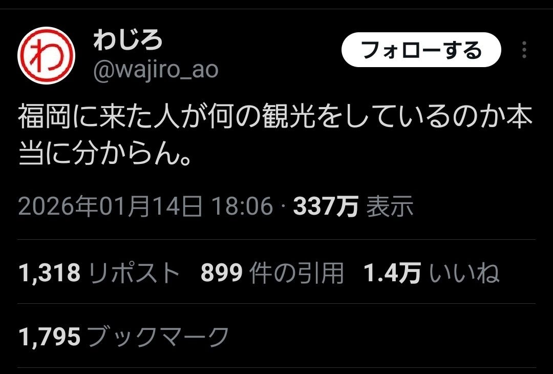 福岡県民「福岡って見るもの何もないよね。観光客って何を目的に来てるんだ???」
