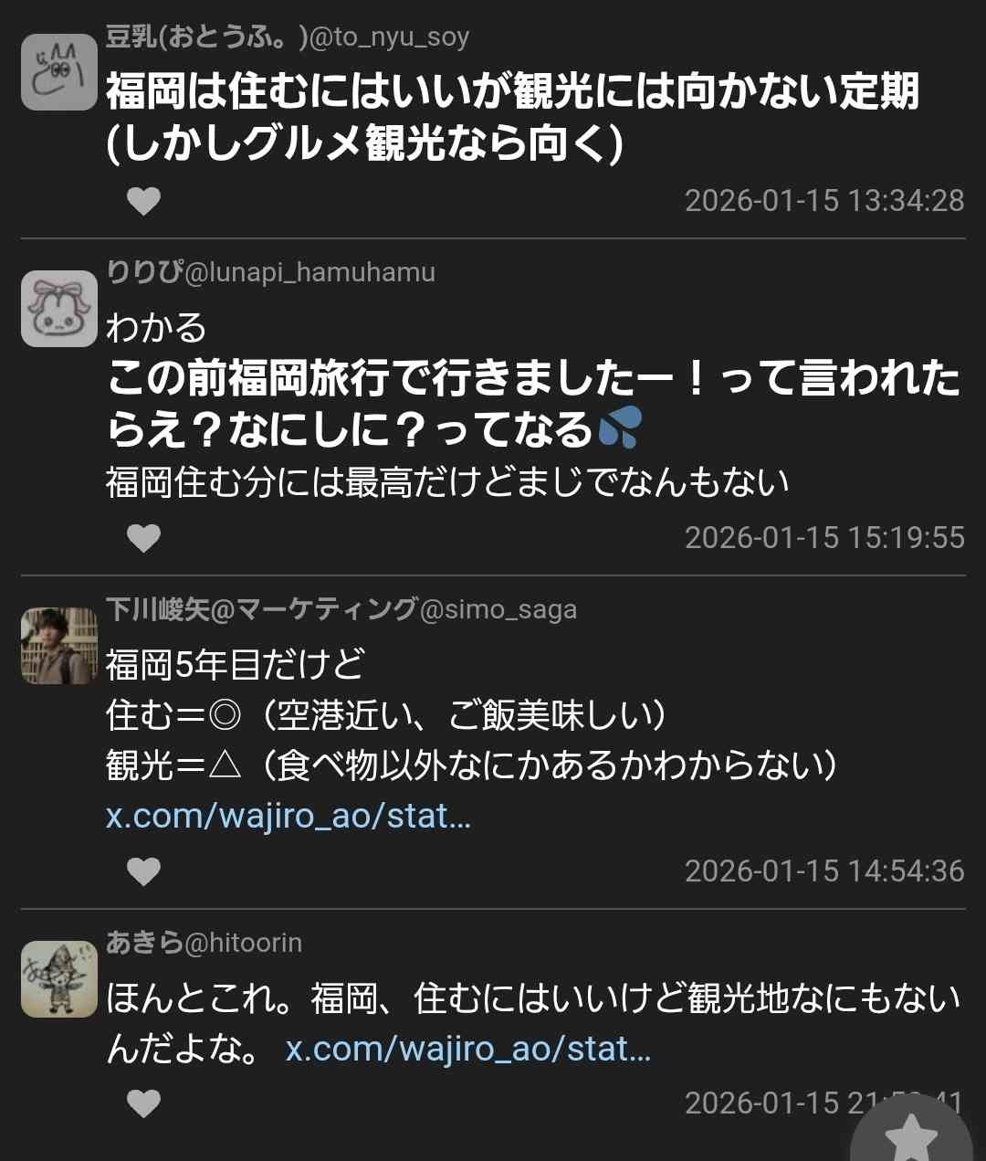 田舎の奴らなら博多と天神行くだけで十分だと思うけど都会から来た奴らは地元と変わらんかそれより下の街見ても大して楽しくないだろうから来る意味ないなと思う