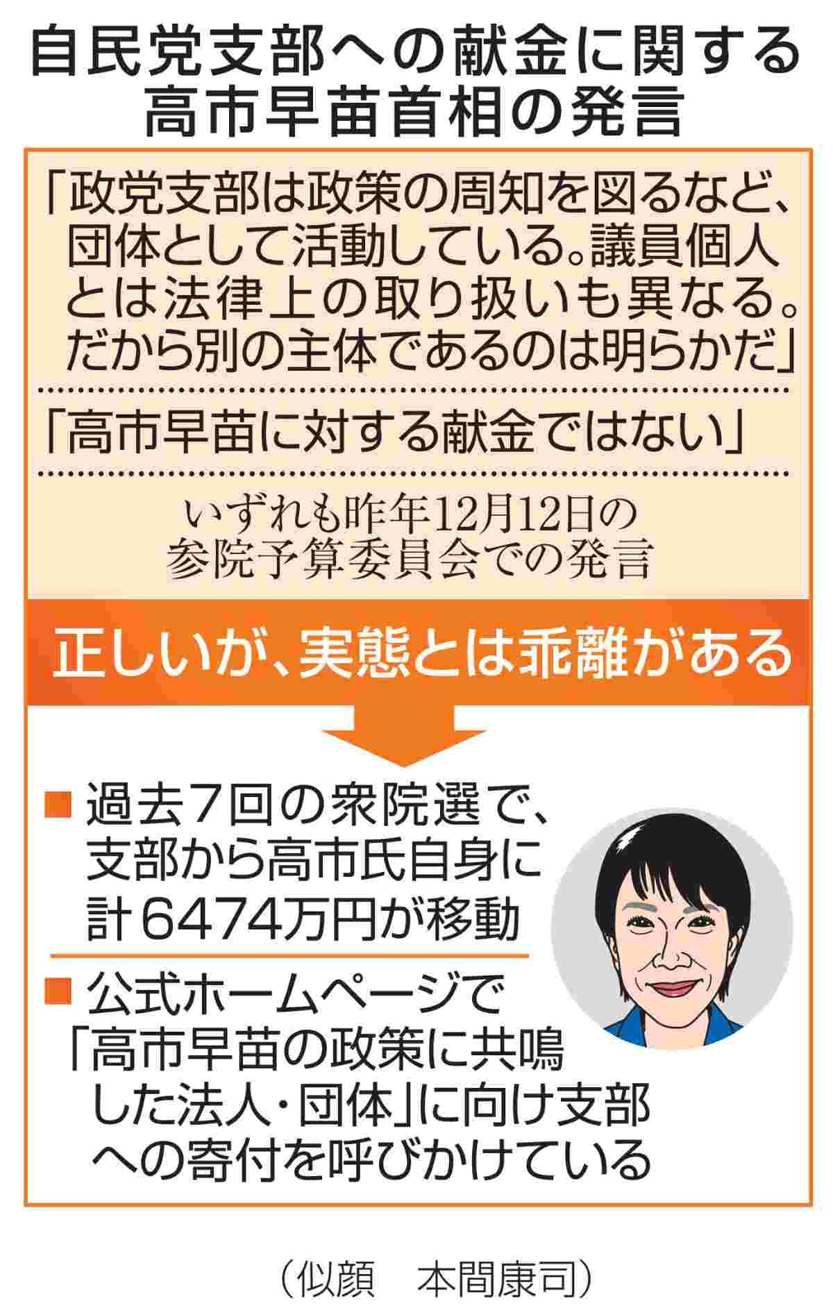 高市氏が代表の「自民党奈良県第2選挙区支部」が24年に上限を超す企業献金を受けていたことが昨年発覚。12月12日の参院予算委員会で政党支部への認識を問われ「たまたま私が支部長だった。高市早苗に対する献金ではない」などと主張していた。