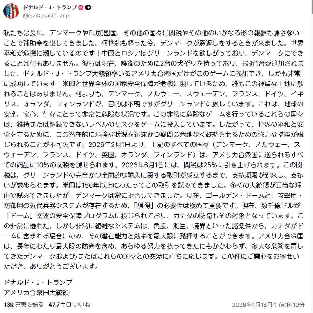 トランプ「グリーンランドをよこせ、さもなくば2026年2月からデンマーク、欧州8か国に関税10%、6月から25%に引き上げる!」