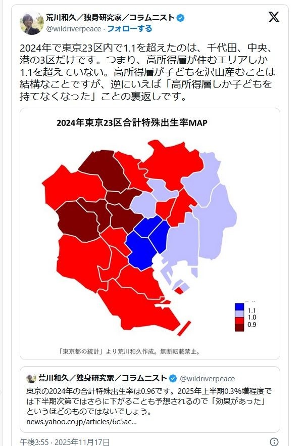 2024年東京の出生率0.96へ低下「子どもを持てるのは高所得層だけになった?」