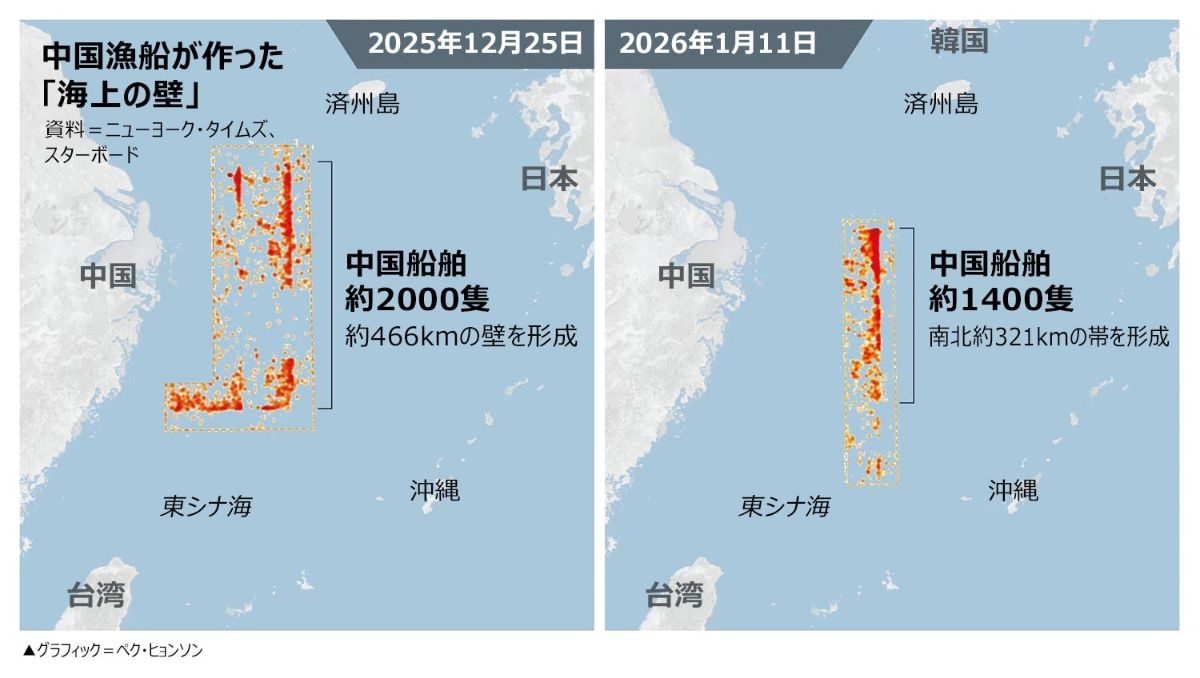 「中国はこの1カ月間、東シナ海で漁船数千隻を2回、同じ海域に集結させ、最大で466キロメートルに達する『海上の壁』を作った」と米ニューヨーク・タイムズ(NYT)が16日に報道した。