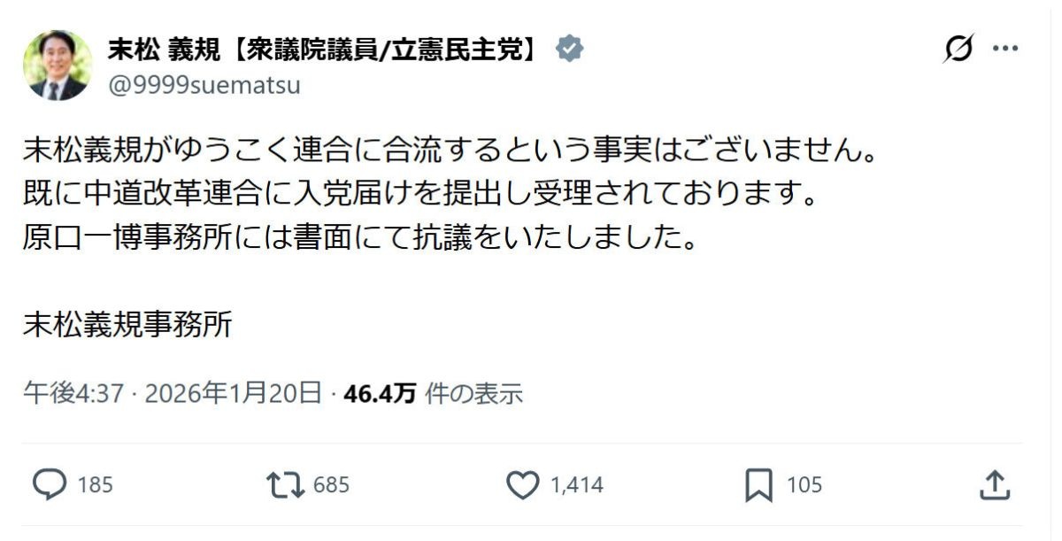 立憲民主党の末松義規衆院議員の事務所は20日、末松氏のX(旧ツイッター)を更新。立民と公明党の新党「中道改革連合」には参加せず、自ら立ち上げた政治団体「ゆうこく連合」の政党化を目指す考えを表明した原口一博衆院議員の主張に、真っ向から反論した。