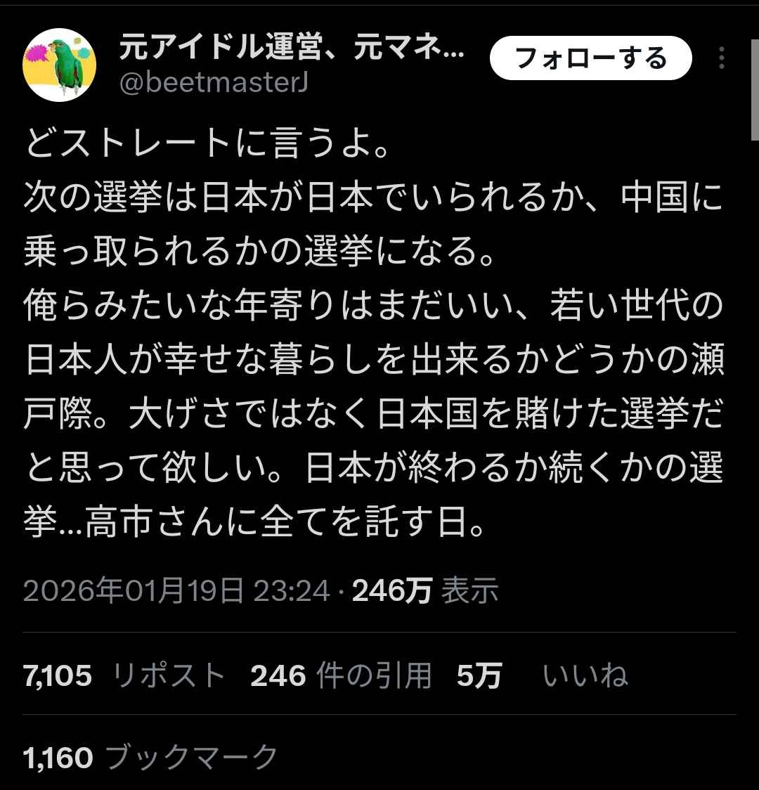 「日本が日本でいられるか、中国に乗っ取られるかの選挙になる。高市さんに全てを託す日」5万いいね