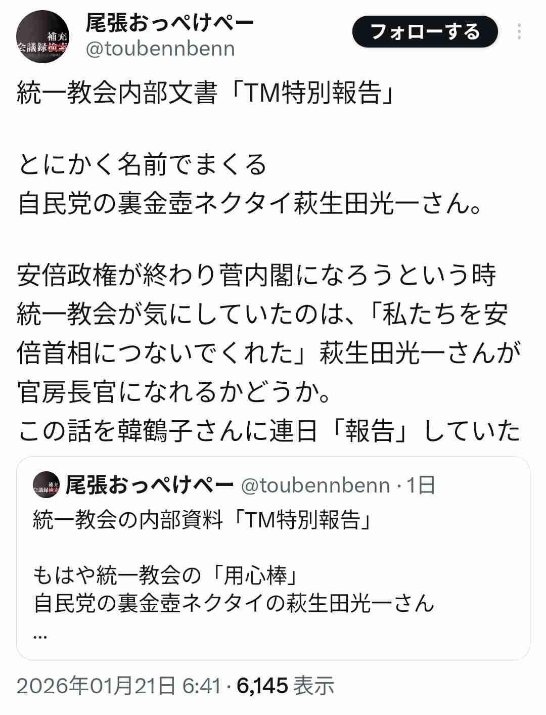 このペテン師って統一教会全然追及してないんだよな