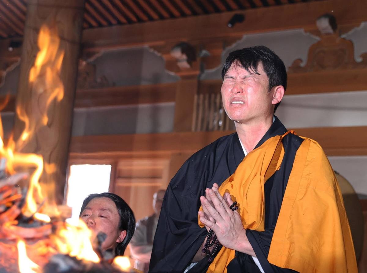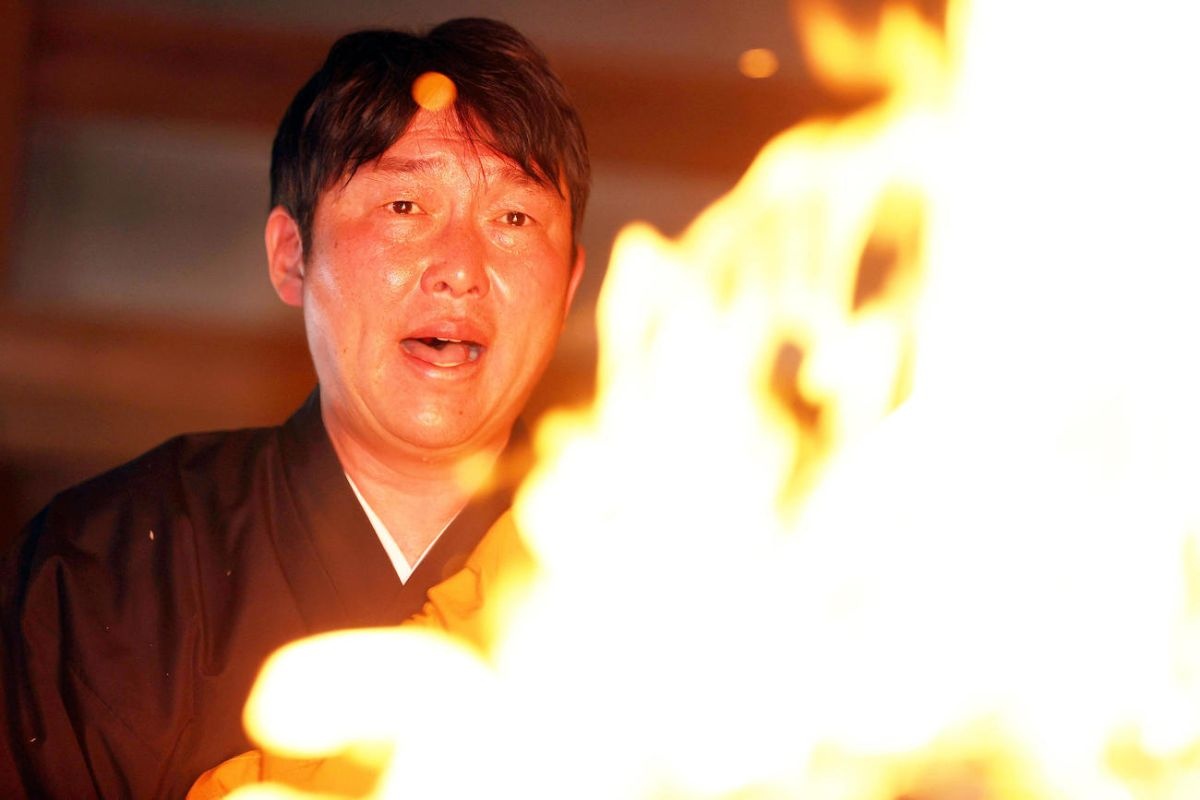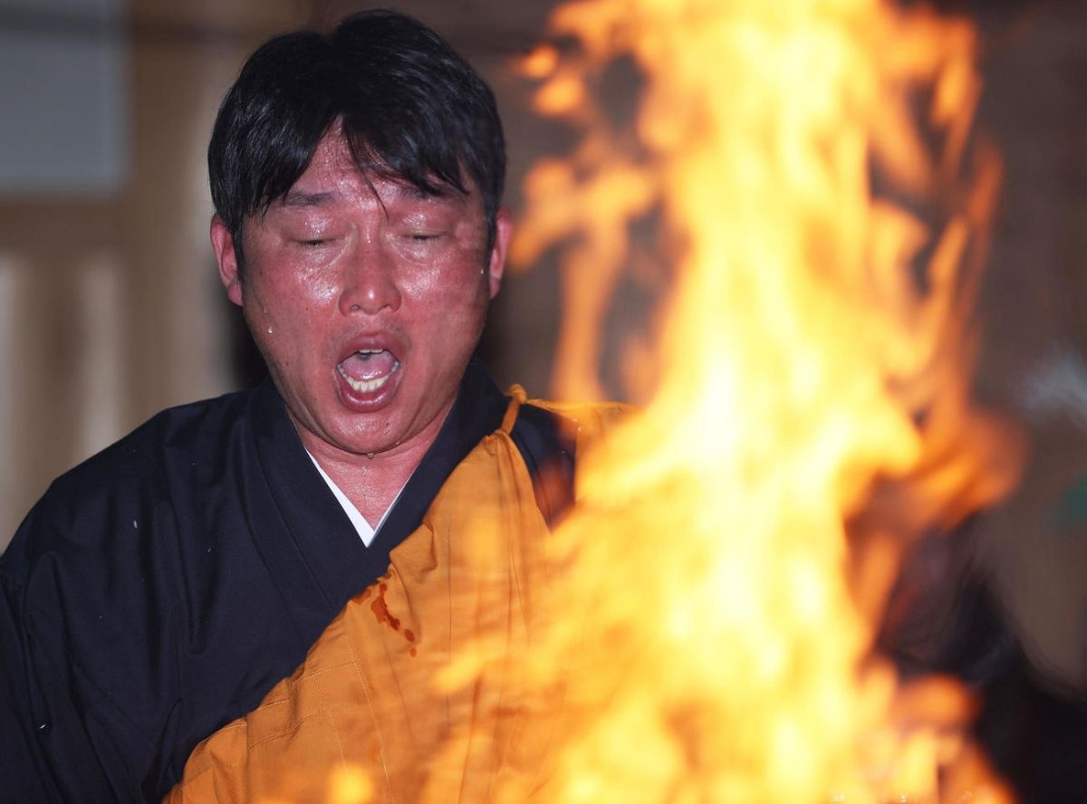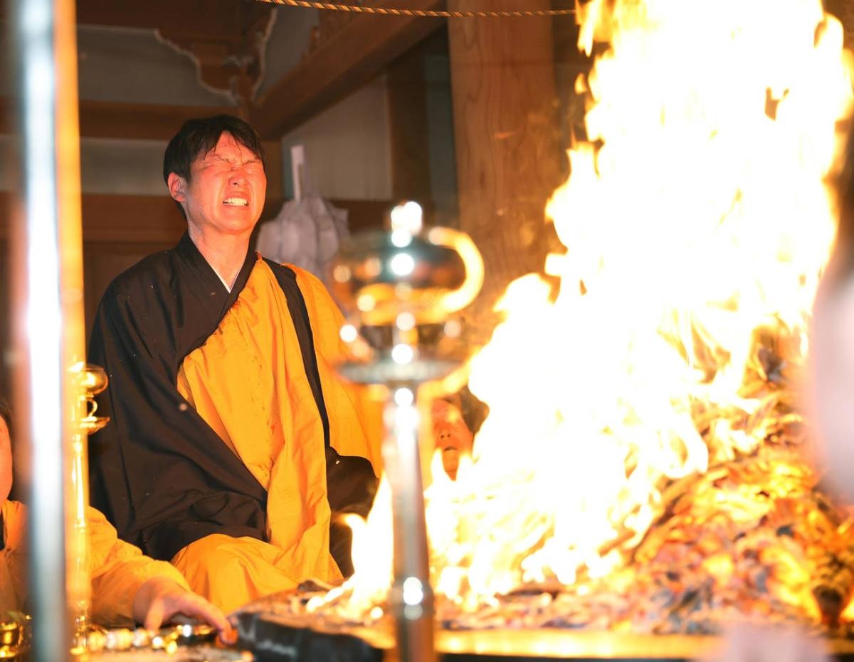 眉毛とまつげはもう防波堤の意味を成していない。額からとめどなく伝う汗と目の前の護摩木から巻き上がる熱波と煙。高さ最大3メートル、