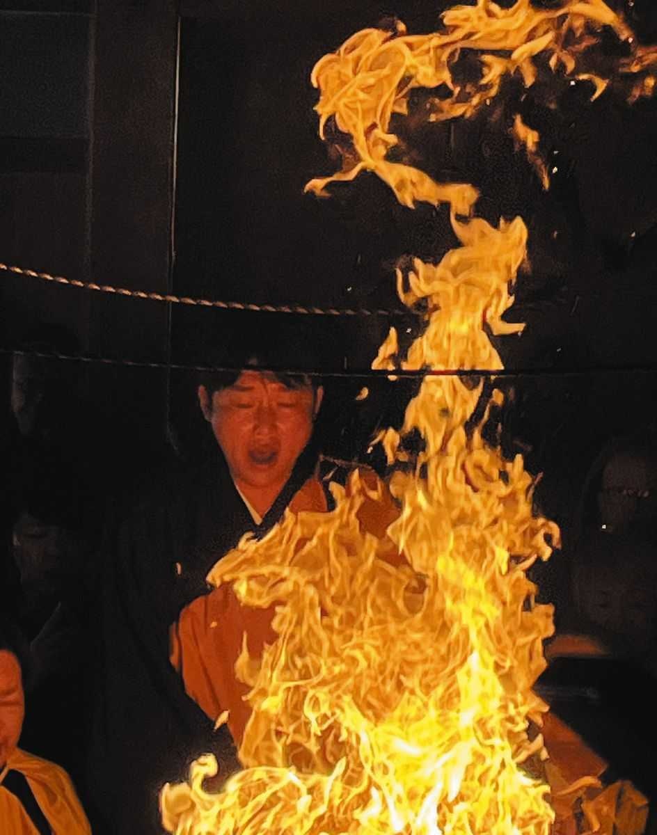 最高400度になる火柱を前に新井監督は一瞬、目を強く閉じた。そして目いっぱい見開くと炎の頂点を見た。「今年、絶対に高く跳び上がる」。