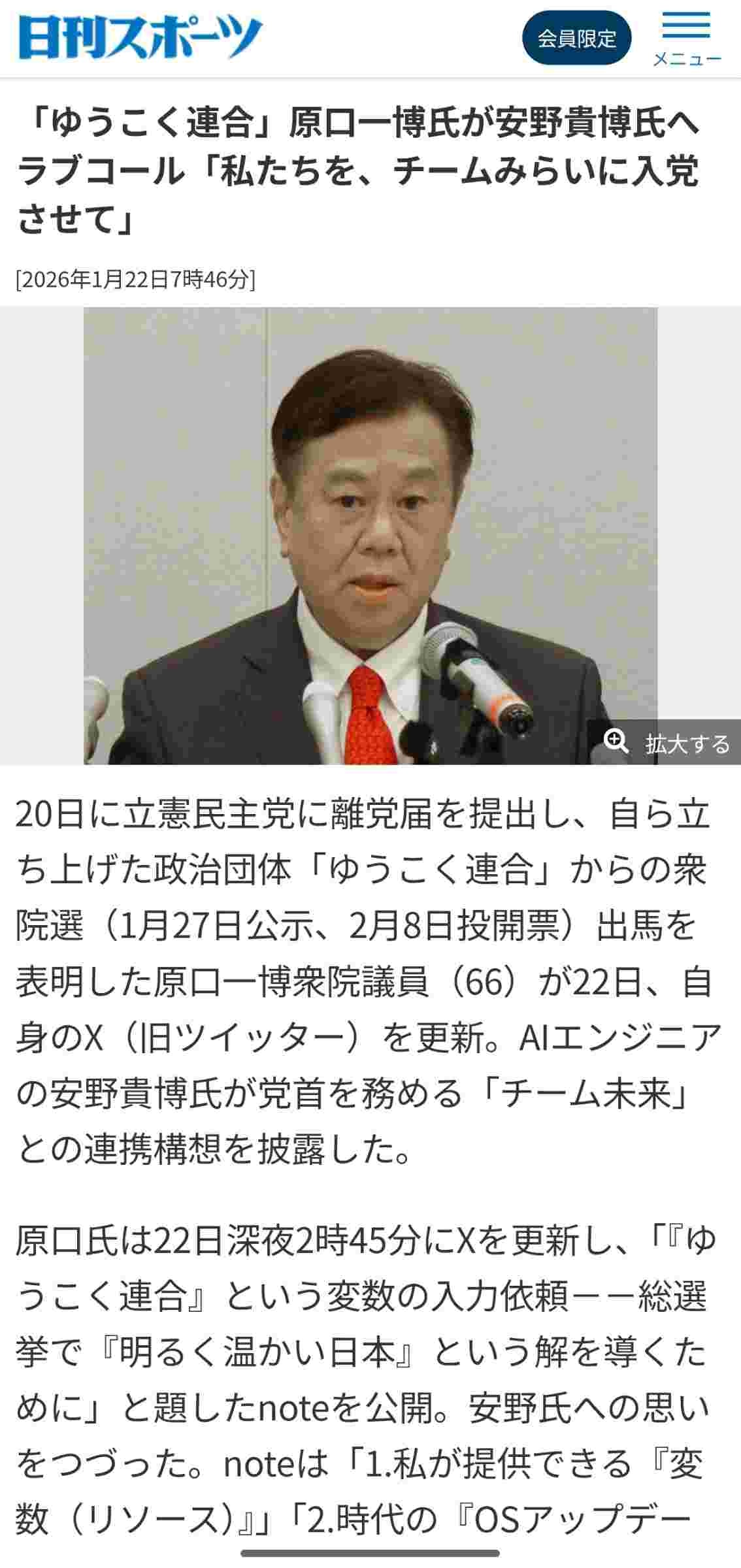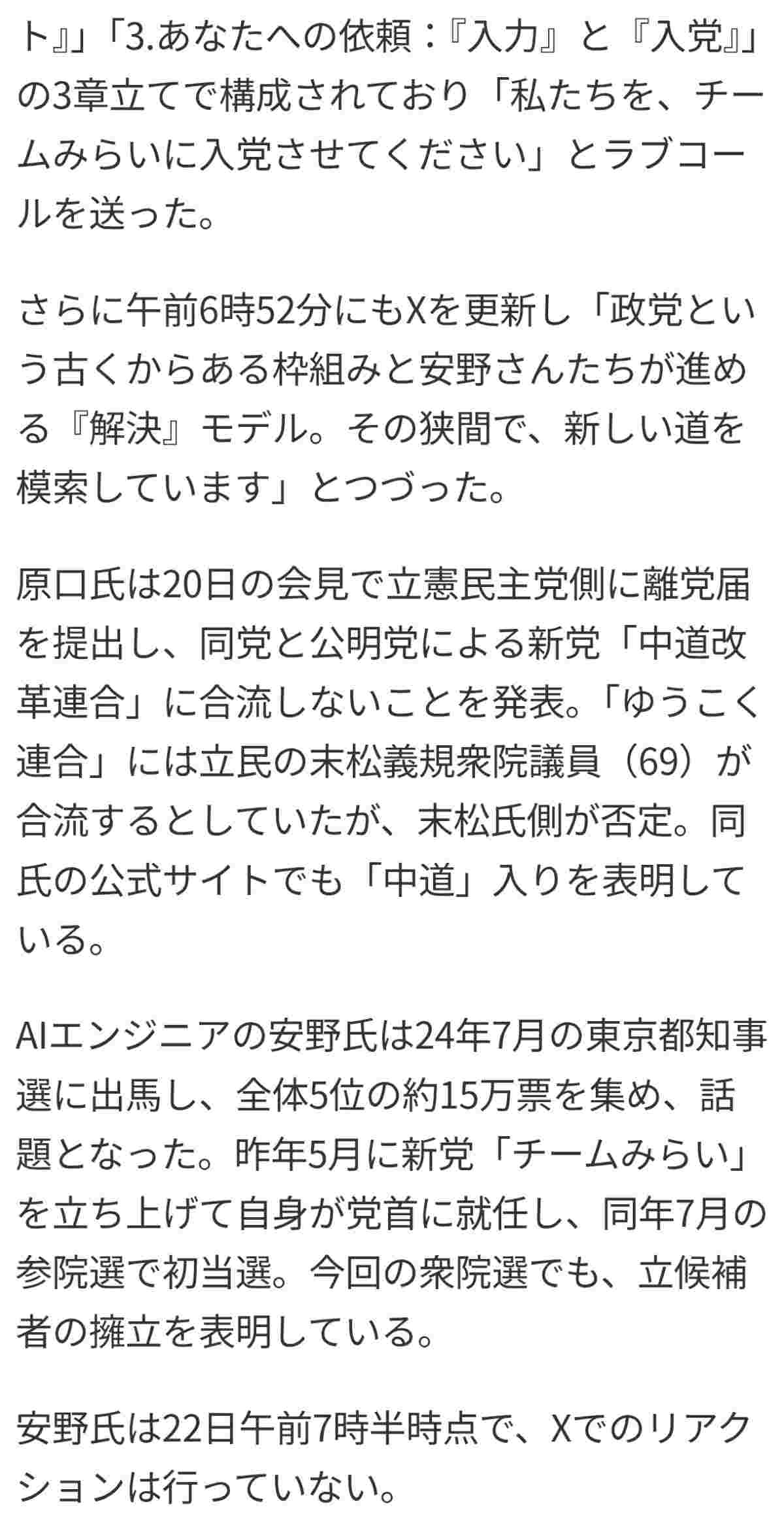 >>安野氏は22日午前7時半時点で、Xでのリアクションは行っていない。