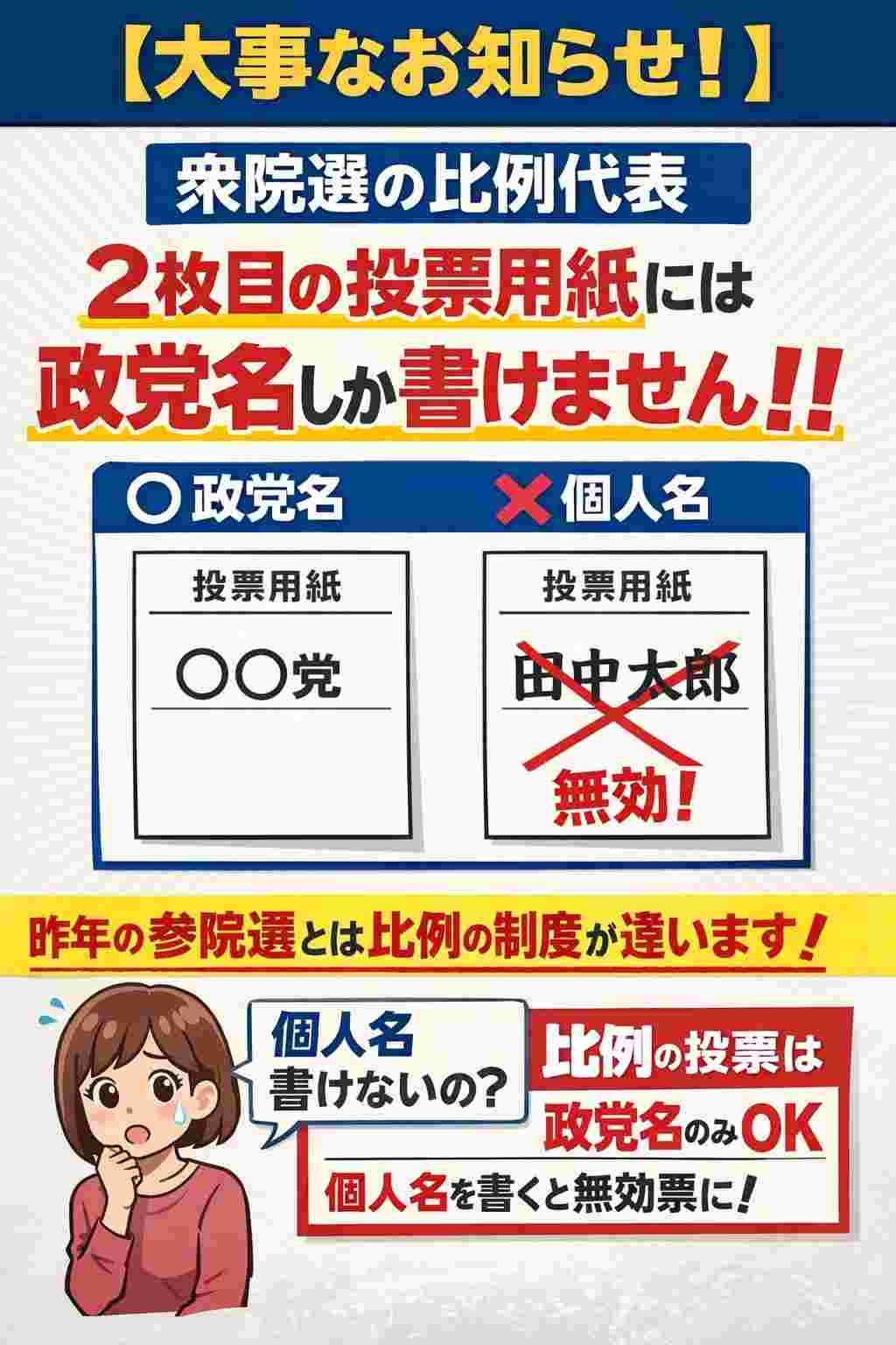 投票所でも比例投票するときは政党名以外書くなと注意のポスターみたいなの貼られるやろ