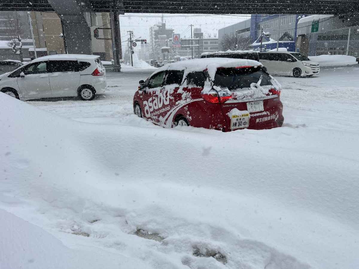 この雪道で本免試験は大変や