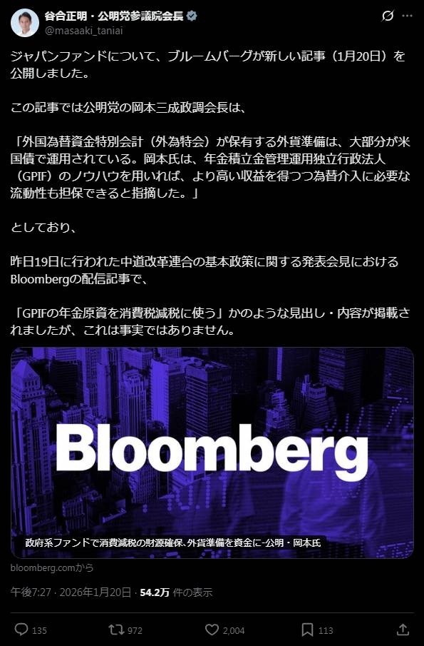 昨日19日に行われた中道改革連合の基本政策に関する発表会見におけるBloombergの配信記事で、
