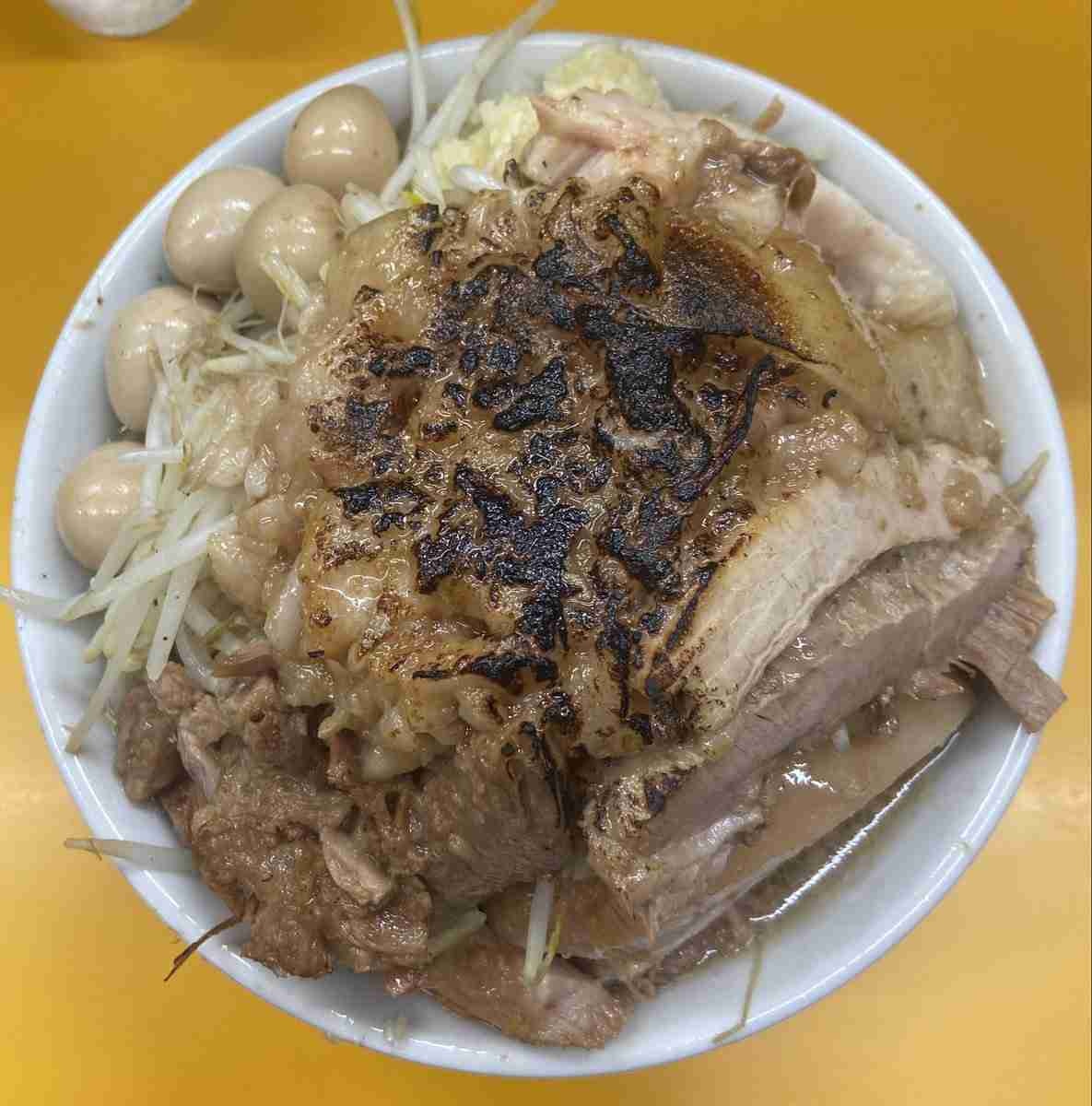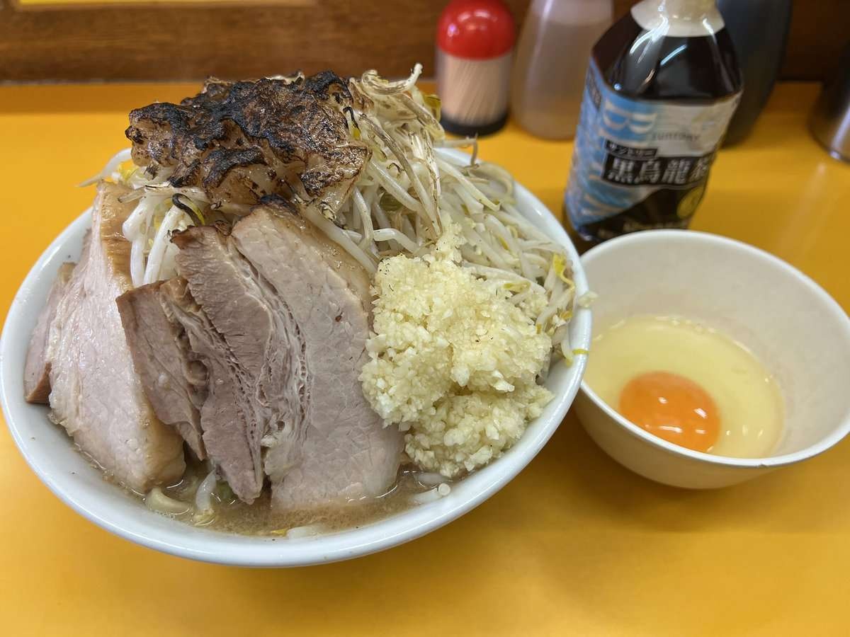 ラーメン(普通300g,800円)・ヤサイ・ニンニクマシマシ・焦がしアブラ・生卵(50円)。