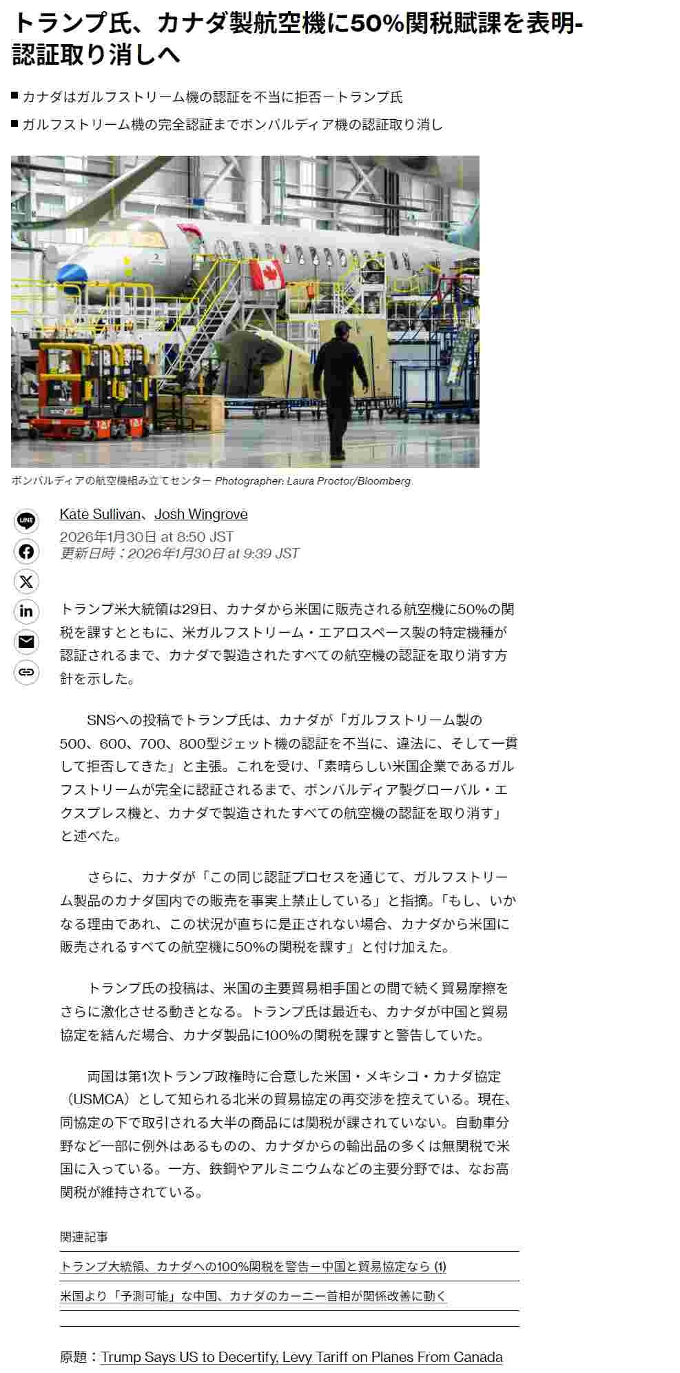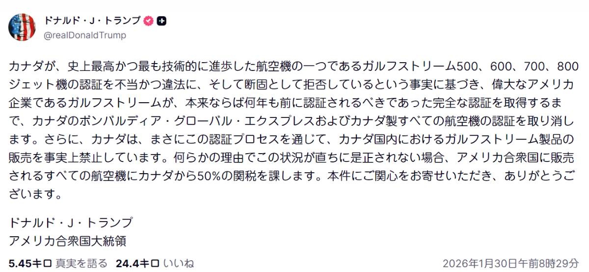 これはカナダによる米ガルフストリームへの嫌がらせなんだから、トランプの報復には筋が通ってる