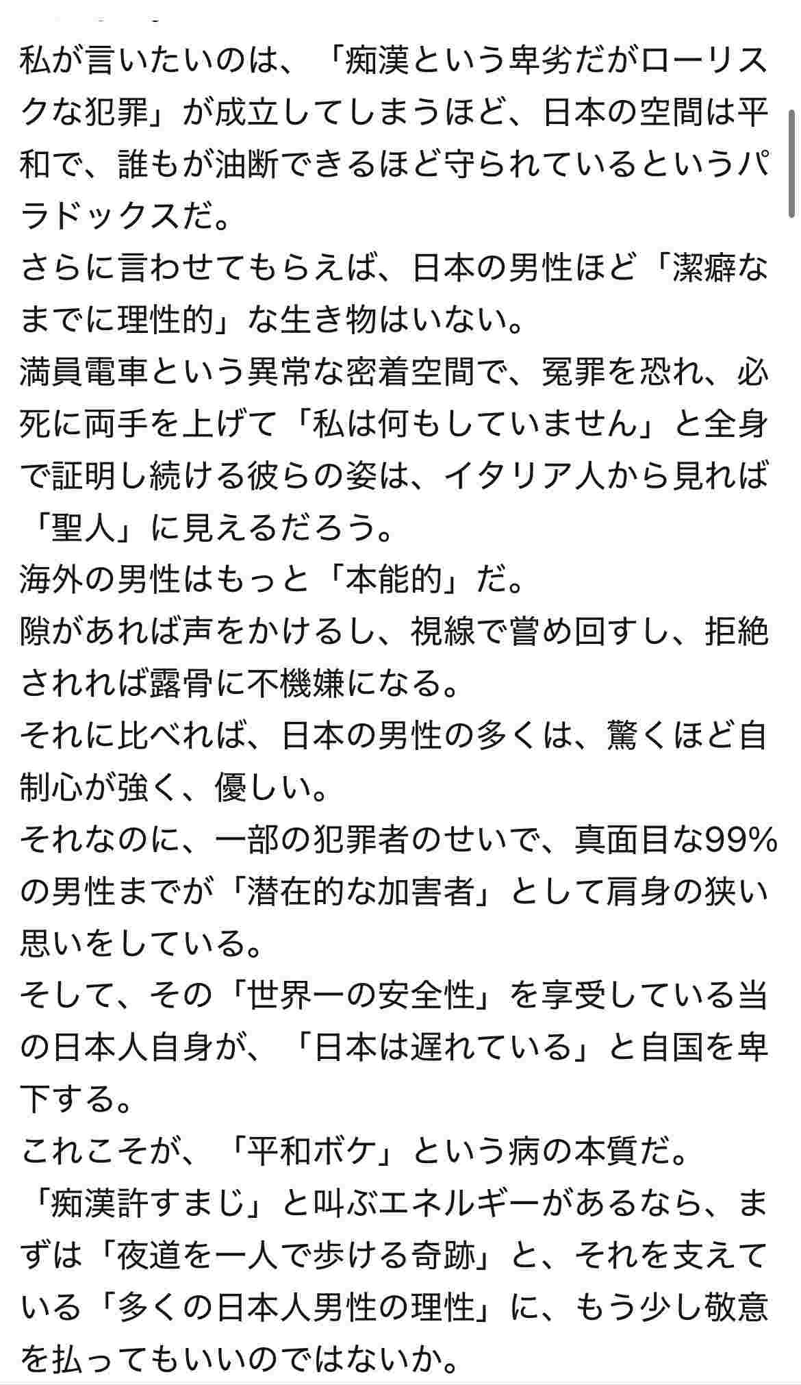 性加害しないのはまともな人間として当たり前のことなんだから、そこを感謝までしろってのは日本男にマンセーしてほしくて擦り寄りすぎてるわ