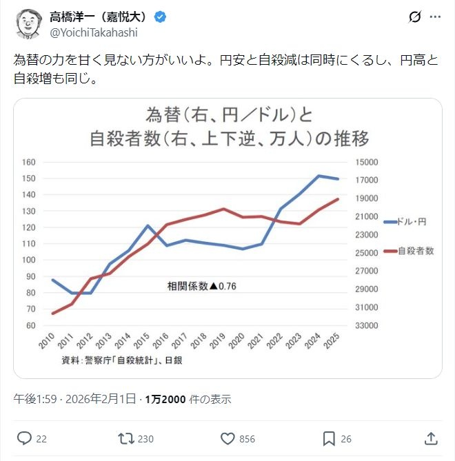 円安が直接的に自殺率に関係あるわけねえだろクソ時計泥棒