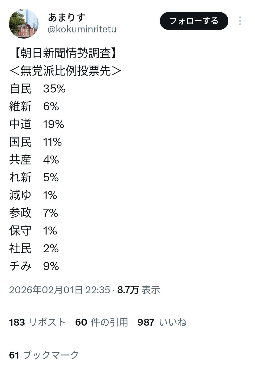 だとしても自民40%中道25%みたいな計算になるからだから厳しくはあるが
