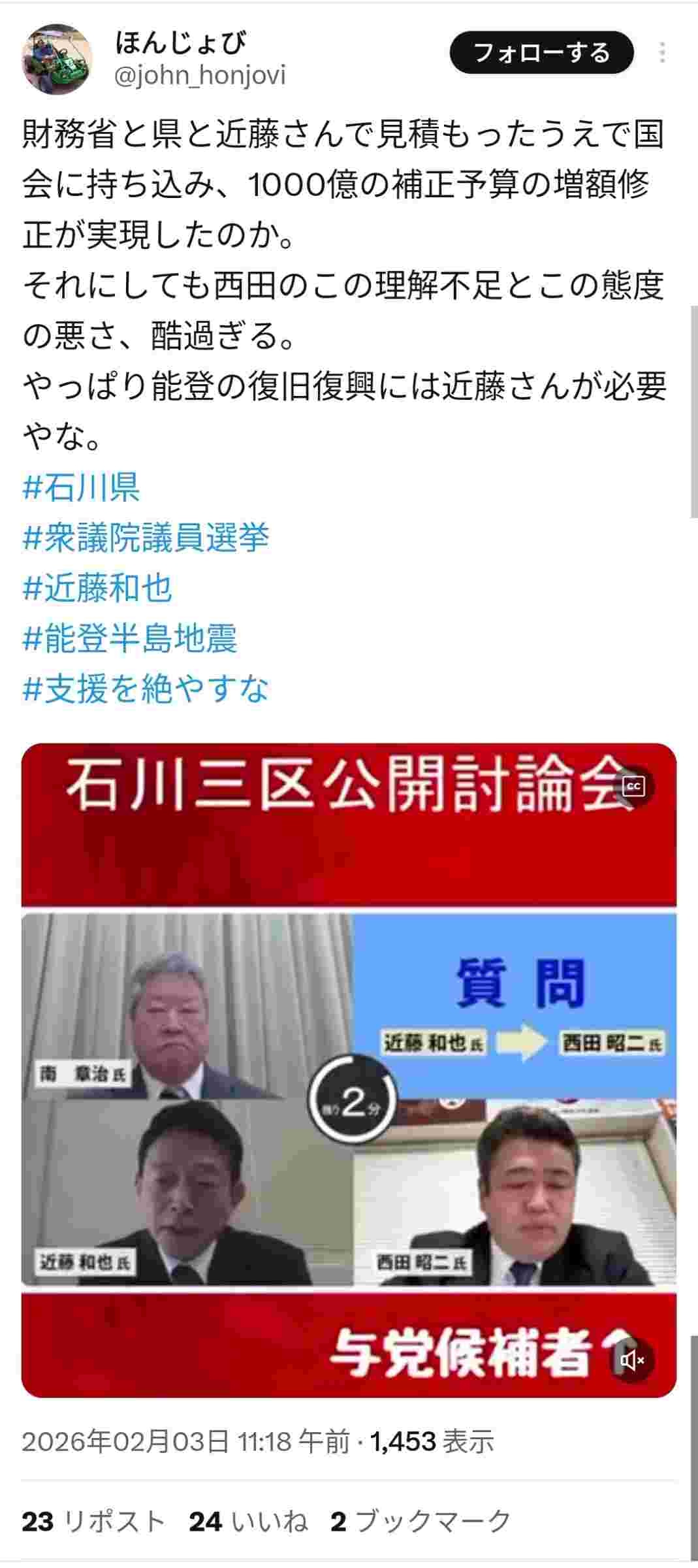 能登、高市自民勝利か…復興のために補正予算引き出した中道議員は劣勢