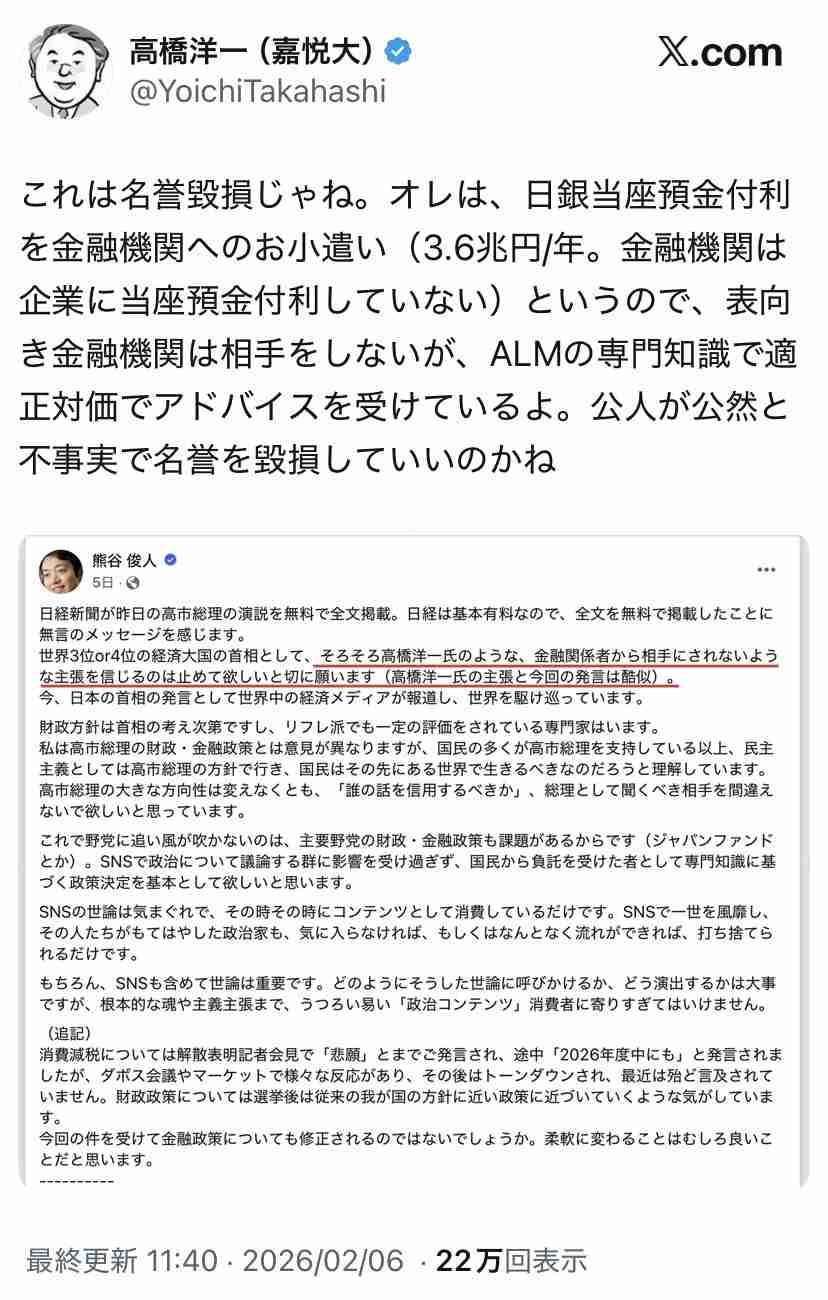 高橋洋一の発言と高市早苗の発言は全く同じだから名誉毀損になるわけねーだろ。だいたい円安でホクホクなんて高橋洋一ぐらいしか使わないだろ