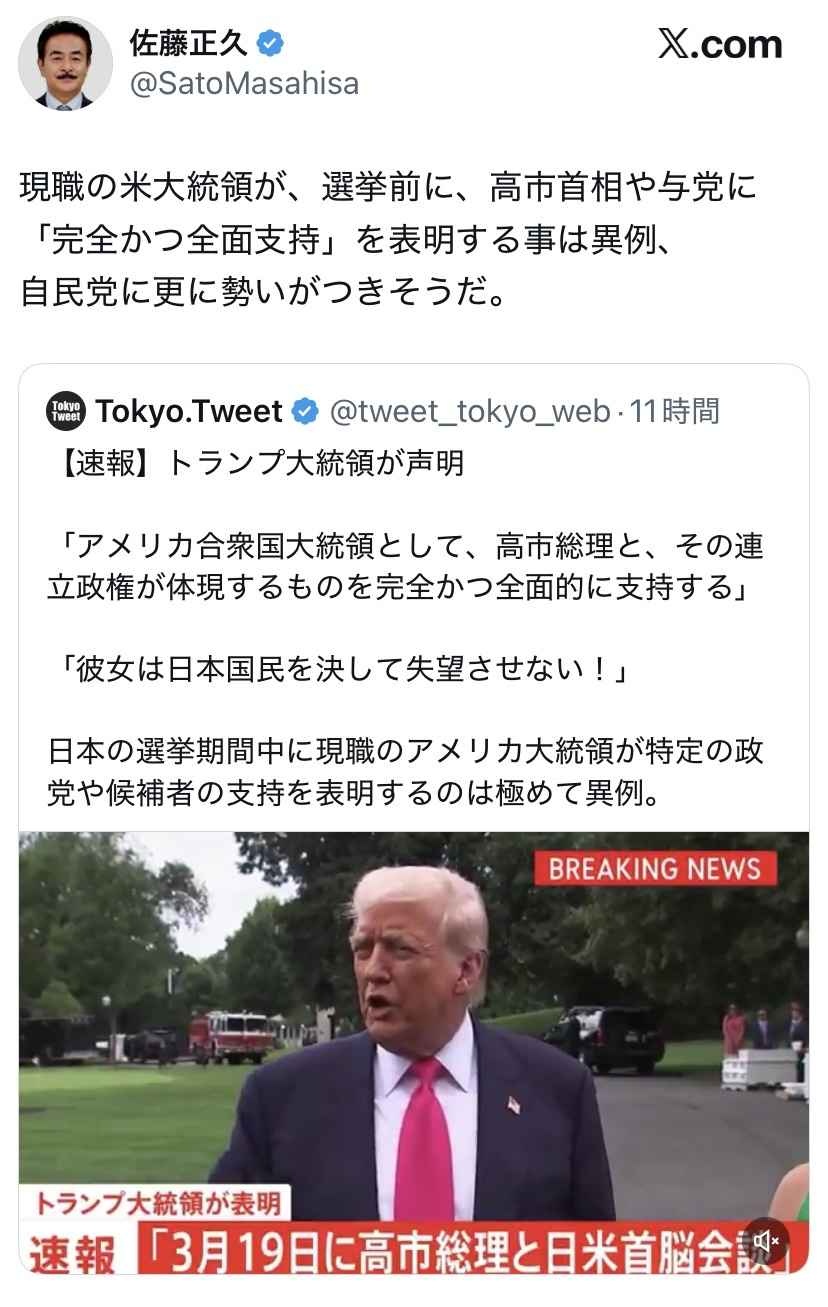 自民党のヒゲ「選挙前に現職の米大統領が高市首相の支持を表明するのは異例、さらに勢いがつきそうだ」