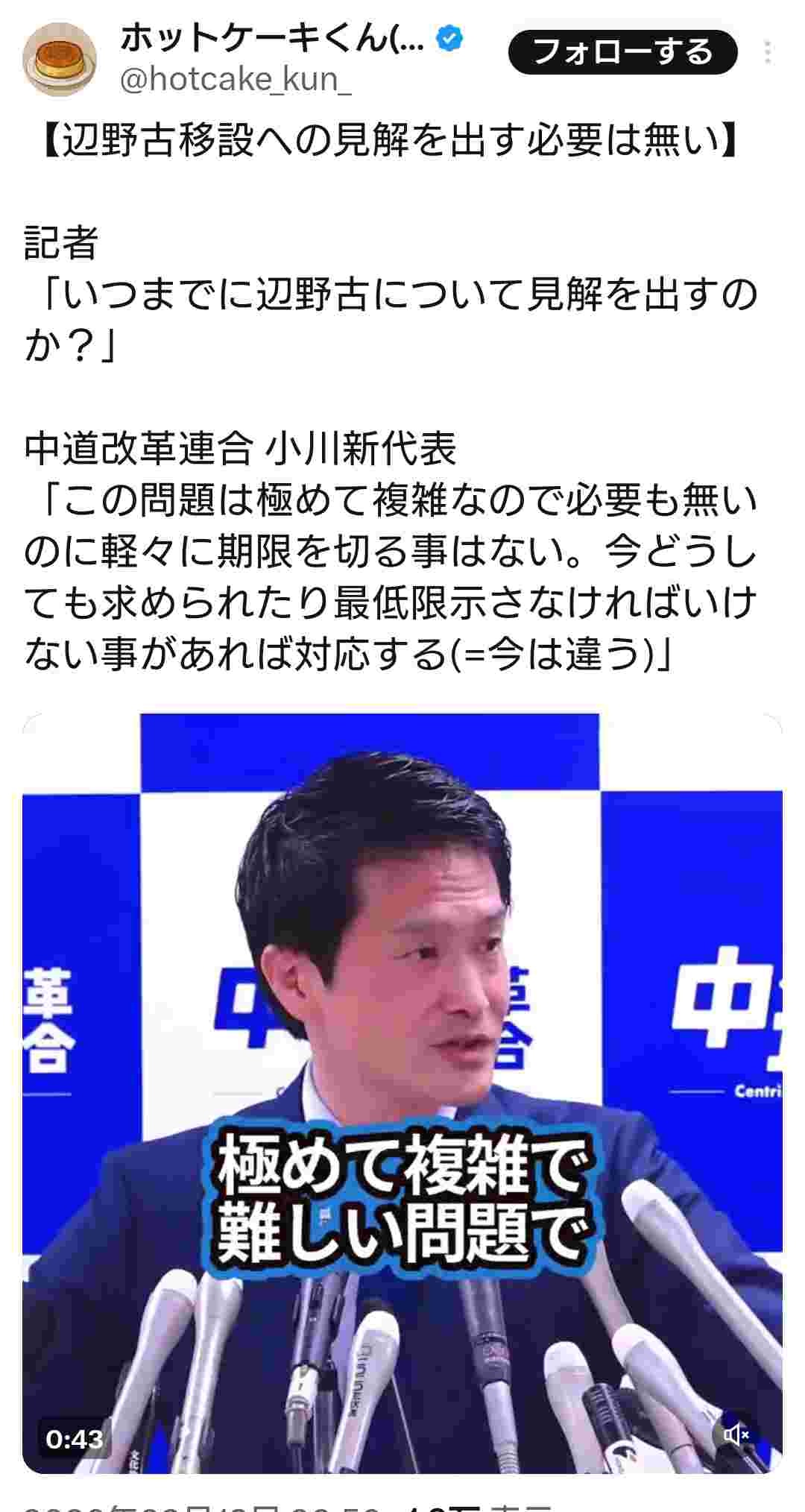 中革連 小川新代表「辺野古移設問題は極めて複雑なので軽々に見解を出すのに期限を切る事はない」