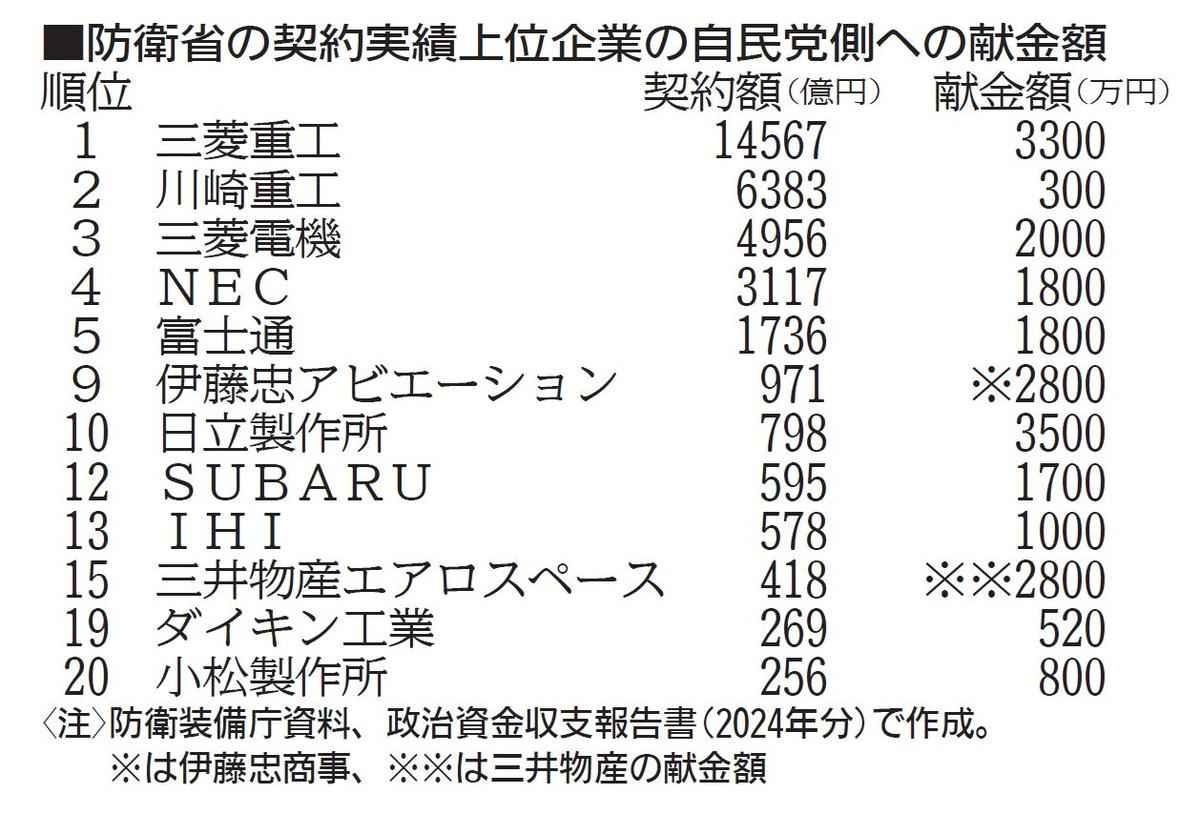 防衛装備庁が公表している24年度の防衛省本省(中央調達)の契約実績上位20社について、献金額を同年分の「政治資金収支報告書」で調べたもの。