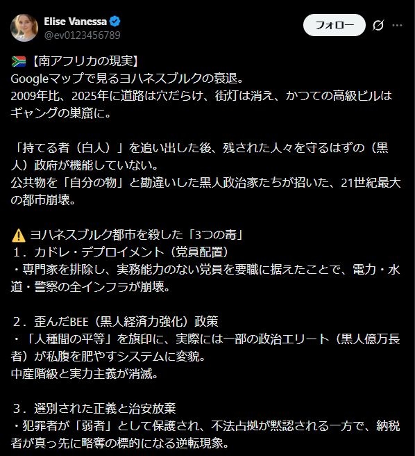 AI頼みの低学歴バカウヨは知らんだろうがノーベル平和賞受賞者のマンデラは白人支配の経済構造はそのままで民主化したから、大半の国民が貧困状態なのはアパルトヘイトの時代から変わっていないんだわ。