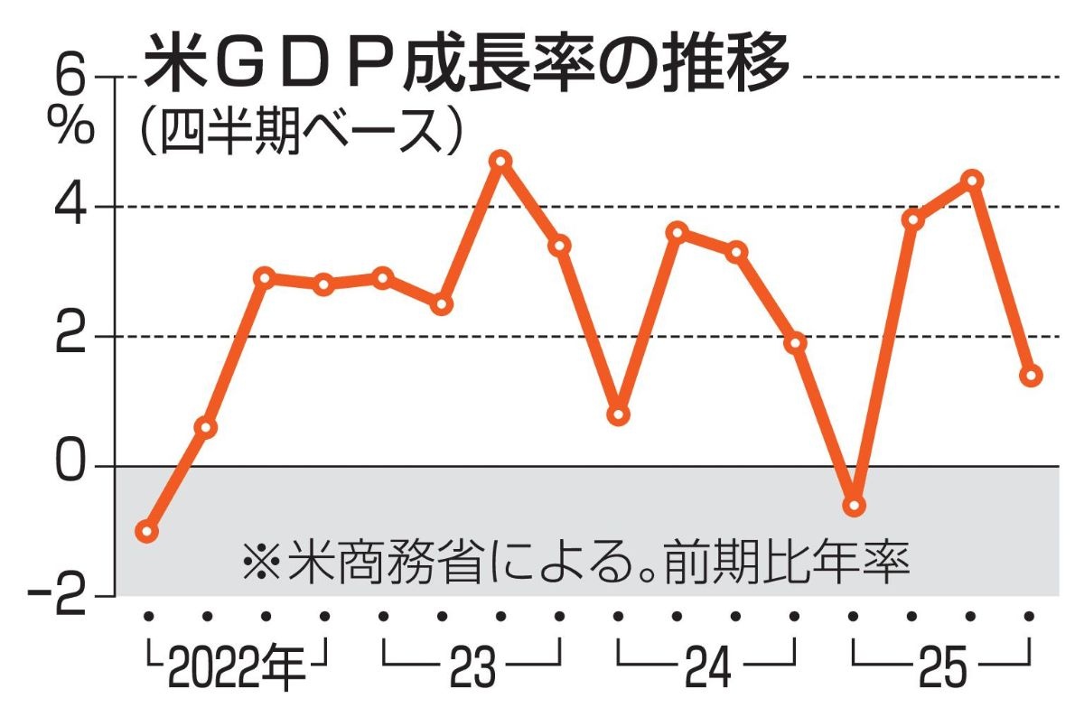 政府閉鎖で落ち込んだGDPは、26年1~3月期以降に一部持ち直すとみられている。同時に発表した、第2次トランプ政権が発足した25年の通年のGDPは前年比2.2%増だった。伸び率は前年の2.8%増から縮小し、マイナス成長だった20年以来の低水準だった。