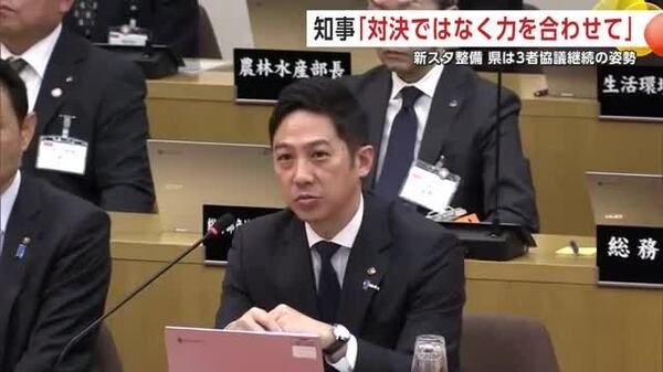25日に開かれた2月県議会の一般質問で、議員からスタジアム整備について問われた鈴木知事は、3者協議を継続する考えを示しました。