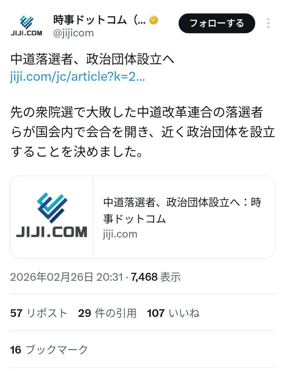 先の衆院選で大敗した中道改革連合の落選者らは26日、国会内で会合を開き、近く政治団体を設立することを決めた。来年の統一地方選の応援や、有識者との意見交換などが目的。出席者の一人は、新党を意図したものではないと説明した。