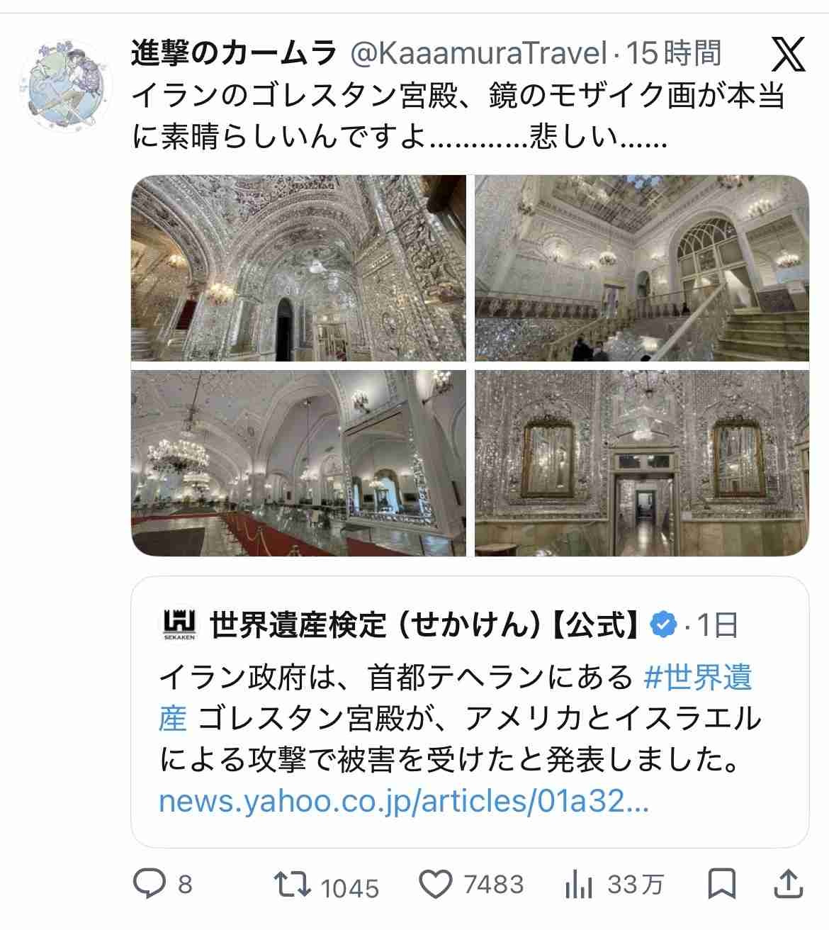 世界遺産ゴレスタン宮殿も被害 米イスラエル攻撃下のイラン首都