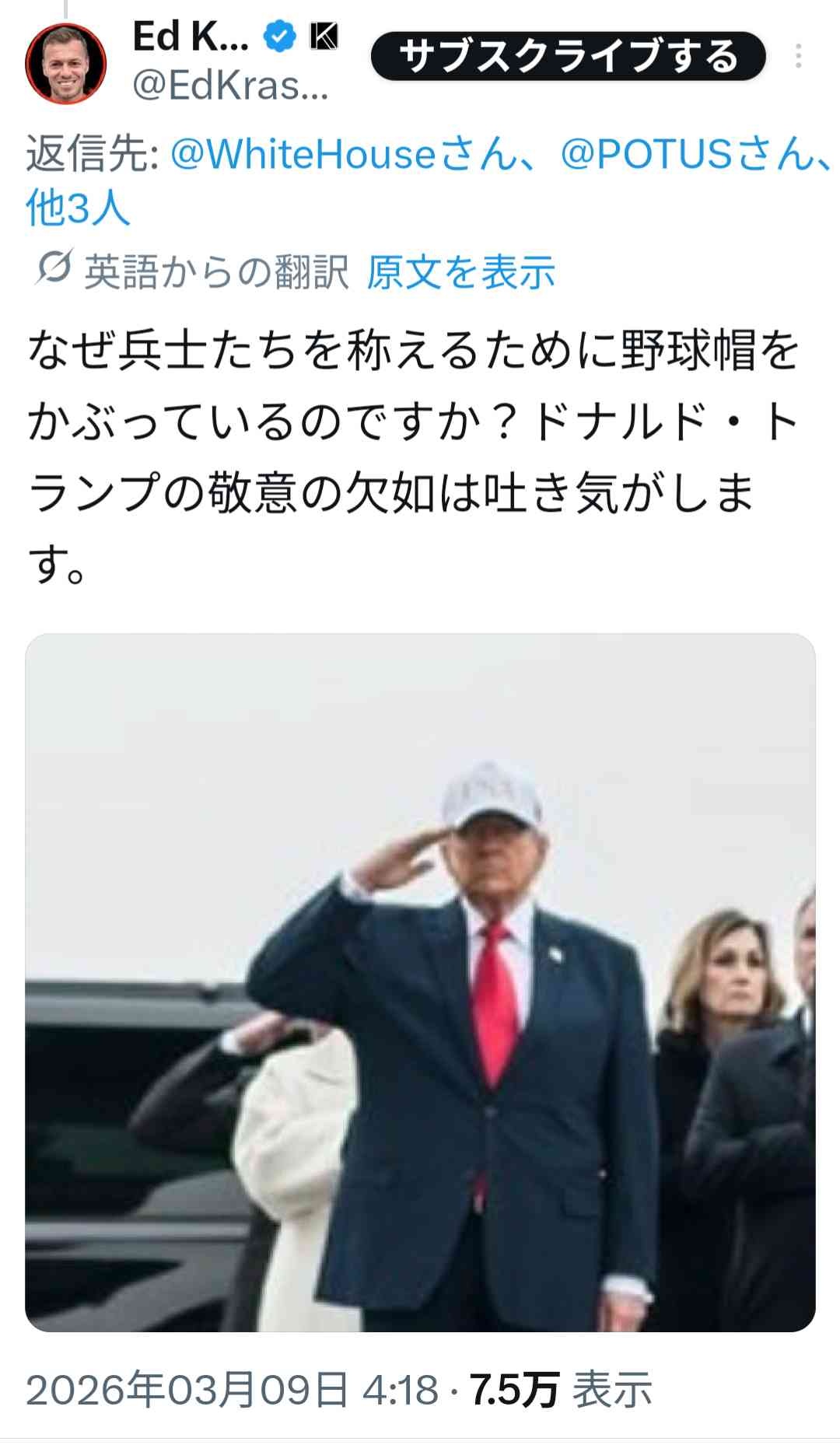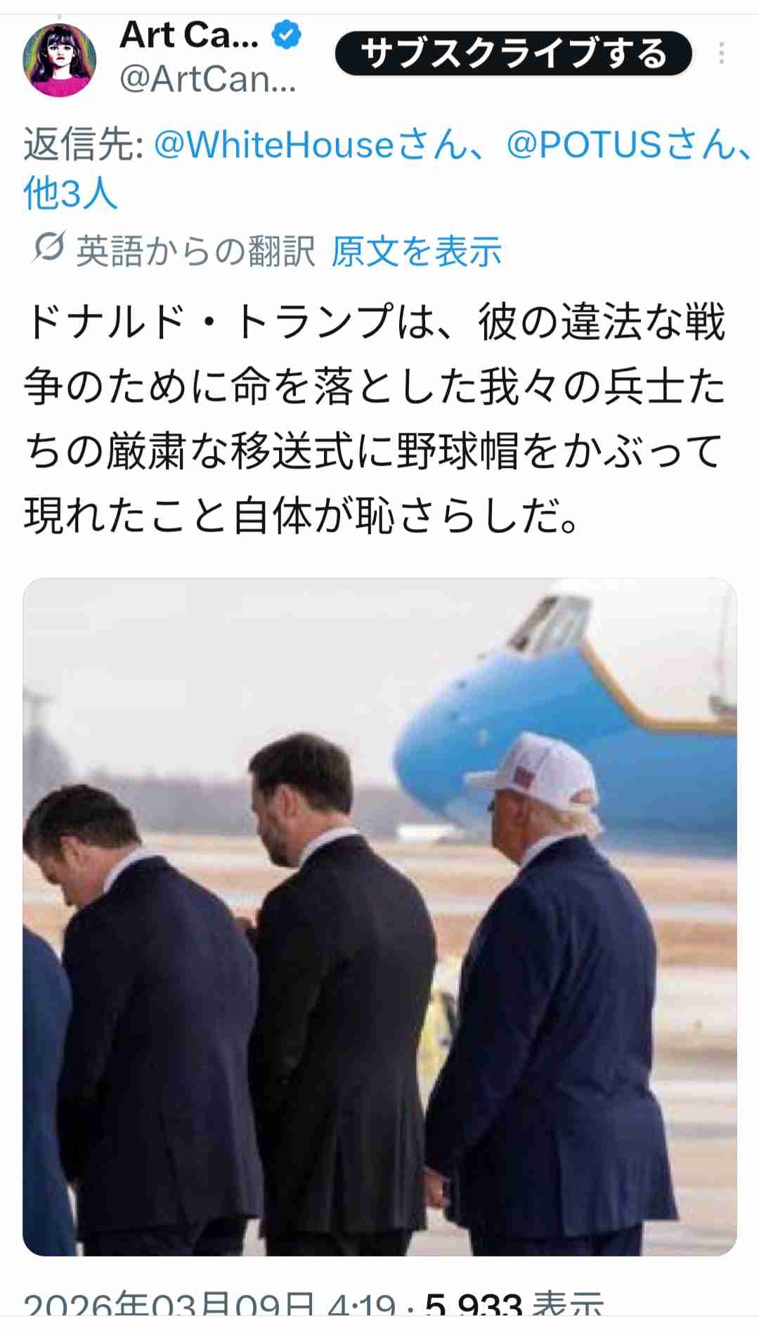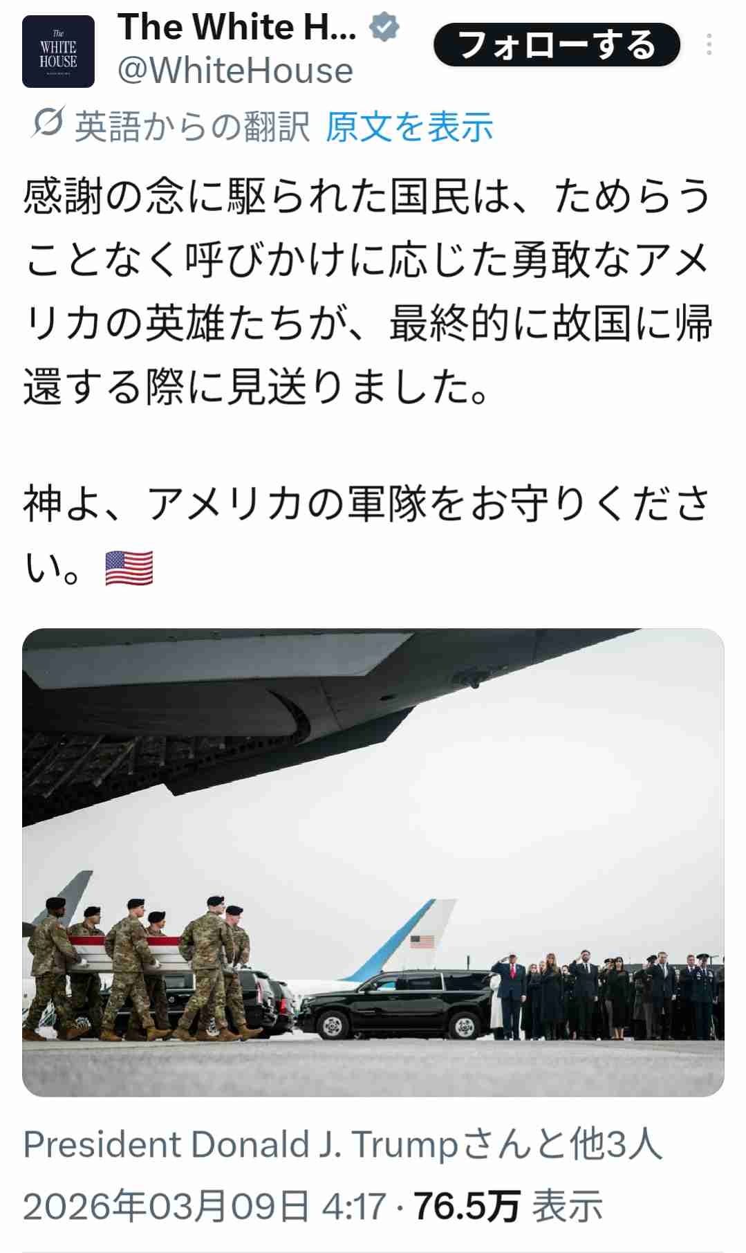 ドナルド・トランプさん、戦死帰国した自国兵士に対してMAGA帽をかぶったまま敬礼🫡無事大顰蹙を買うw