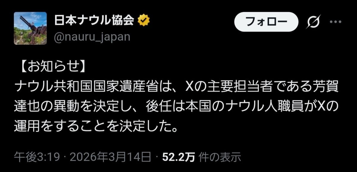 ナウル共和国政府観光局と称するアカウントの中身が『ハンカチ王子と同級生でした!!!!』のみ訴えて中野区議会議員選挙に立候補して59人中51番目の好成績でご落選した経験を持つ男性であることをまだ知らない人がいるんですか???