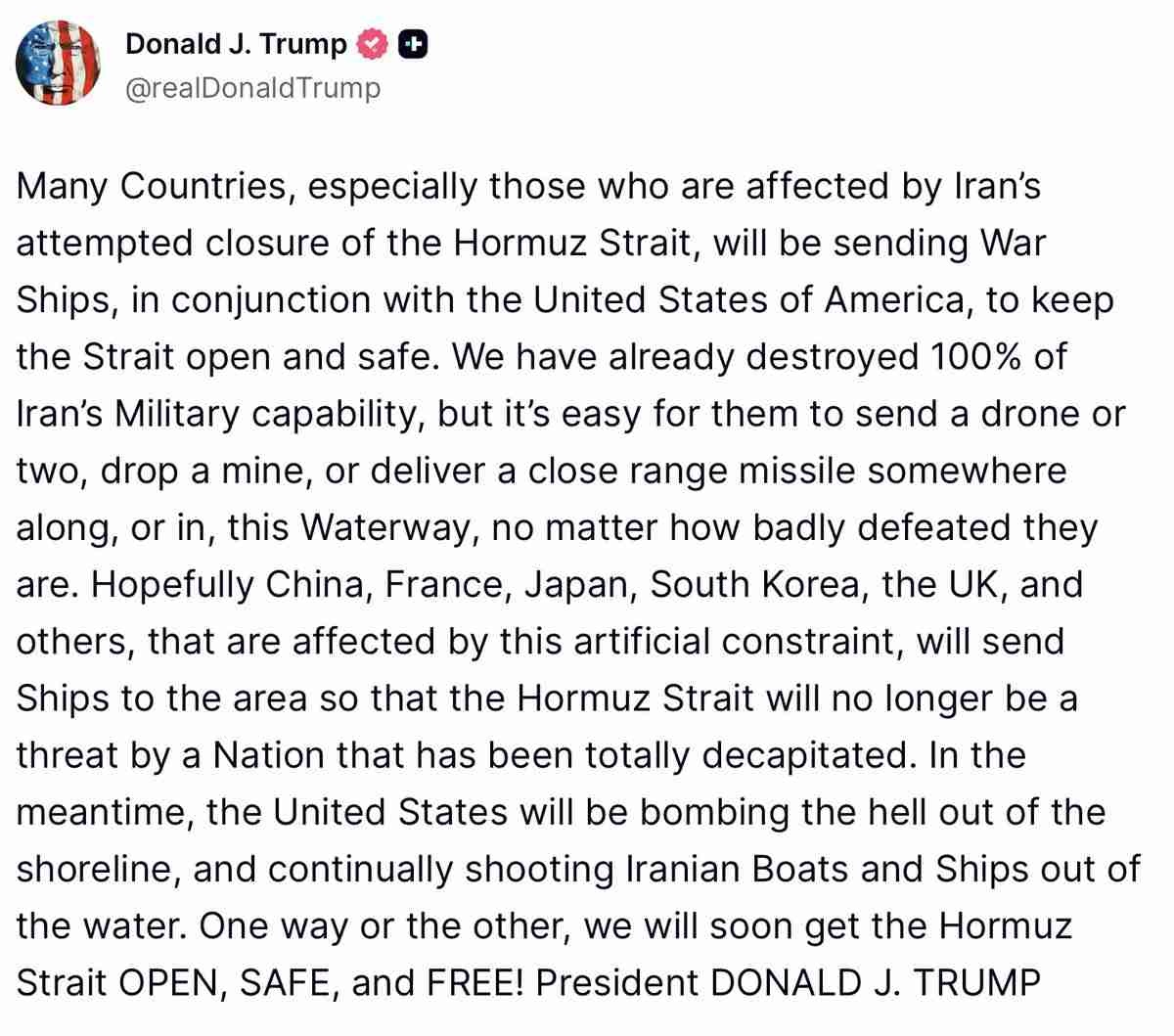 @WhiteHouse“One way or the other, we will soon get the Hormuz Strait OPEN, SAFE, and FREE!” – President DONALD J. TRUMP