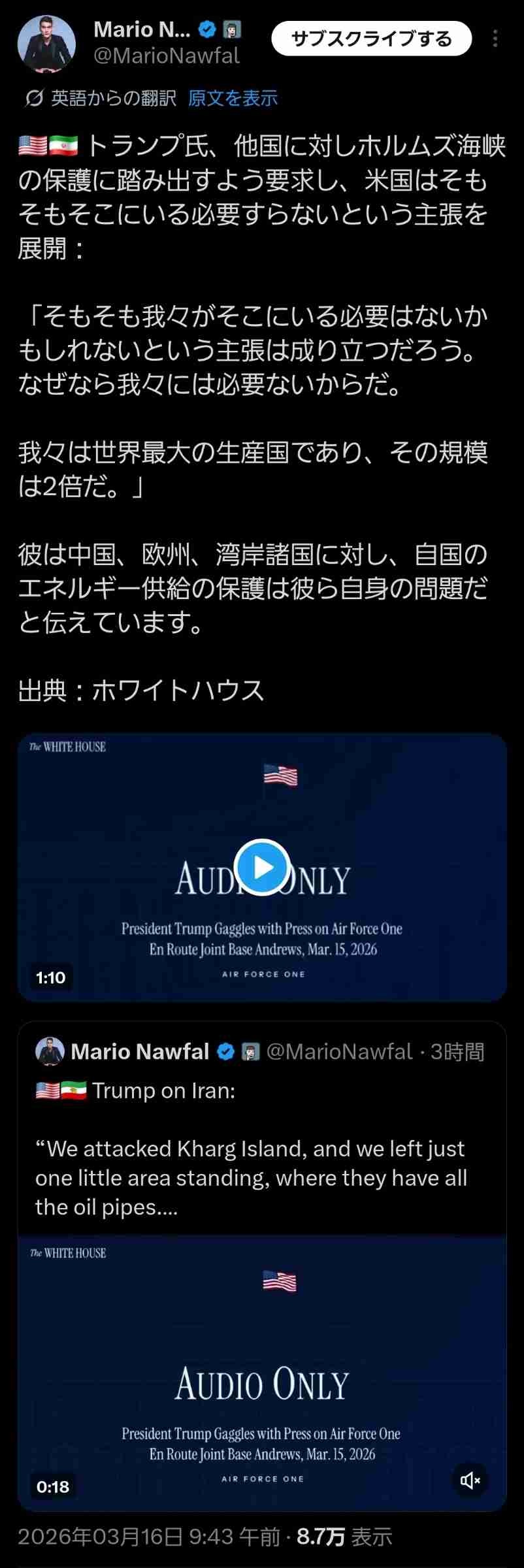 じゃあアメリカはイランからもとっとと撤退しろよ もちろんイスラエルも連れてな お前らがそこにいる必要性などそもそも無いし お前らが世界経済を混乱に陥れて良い理由も無いんだぞ