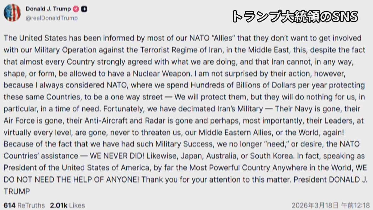 トランプ大統領は17日、自らのSNSに「NATOの“同盟国”のほとんどの国から中東におけるイランのテロ政権に対する軍事作戦への関与を望まないとの通知を受けた」と投稿しました。
